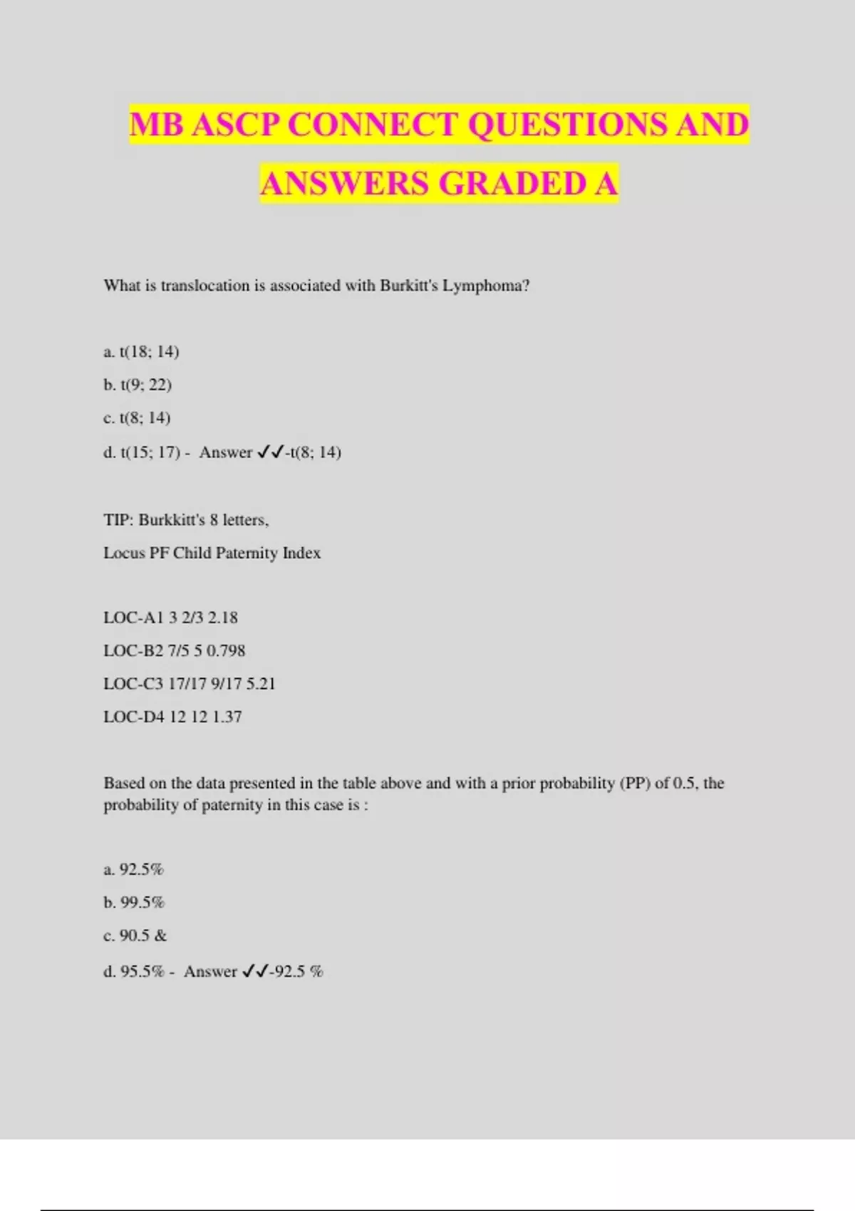 MB ASCP CONNECT QUESTIONS AND ANSWERS GRADED A What is translocation is associated with Burkitt's Lymphoma? a. t(18; 14) b. t(9; 22) c. t(8; 14) d. t(15; 17) - Answer ️️ -t(8; 14) TIP: Burkkitt's 8 letters, Locus PF Child Paternity Index LOC-A1 3 2/3 2.18 LOC-B2 7/5 5 0.798 LOC-C3 17/17 9/17 5.21 LOC-D4 12 12 1.37 Based on the data presented in the table above and with a prior probability (PP) of 0.5, the probability of paternity in this case is : a. 92.5% b. 99.5% c. 90.5 & d. 95.5% - Answer ️️ -92.5 % Multiply all PI together = CPI (CPI x PP) / [CPI x P + (1 - PP) OR ... CPI / (1 + CPI) You have sequenced a gene and observe the following: Reference: atgctggcacgacaggtttcccgactgg Sequenced: atgCctggcacgacaggtttcccgactgg The mutation observed is a: a. Frame-shift mutation b. Insertion c. Silent mutation d. Non-conservative mutation - Answer ️️ -Frame-shift mutation Which of the following is not involved in the splicing reaction? a. 5' splice site b. Hairpin loops c. Branch A point d. 3' splice site - Answer ️️ -Hairpin loops Which of the following statements are characteristics of the melt curve analysis? (hint: more than one answer) a. At the melting point, the probe separates from the target strand and fluorescence rapidly decreases. b. The melting temperature of double stranded DNA depends on its base composition and length. c. All PCR products for a specific primer pair should have the same melting temperature. d. When hybridization probes are utilized, the temperature is incrementally decreased while fluorescence is monitored. - Answer ️️ -At the melting point, the probe separates from the target strand and fluorescence rapidly decreases. The melting temperature of double stranded DNA depends on its base composition and length. All PCR products for a specific primer pair should have the same melting temperature. In the field of molecular diagnostics, which one of the following genes is responsible for the synthesis of DNA, promote cell division, and inhibit cell death? a. Proto-oncogenes b. Tumor suppressor genes c. Oncogenes d. Mitochondrial genes - Answer ️️ -Proto-oncogenes Microsatellite instability is best described as: a. The ability of a gene with repeating elements of 8-10 base pairs to randomly mutate b. Contraction or expansion of the genome caused by frameshift mutations (deletions or insertions) in elements of the genome consisting of a repeating sequence of 1-3 base pairs c. Repetitive elements in the genome with the ability to self-prime, thus creating additional copies of genetic material at the allele loci d. Random gene rearrangement between repeating elements of the same size on different chromosomes resulting in different size gene products - Answer ️️ -Contraction or expansion of the genome caused by frameshift mutations (deletions or insertions) in elements of the genome consisting of a repeating sequence of 1-3 base pairs Purines and pyrimidines differ from each other in that: a. Purines are found RNA; pyrimidines are found in DNA b. There's no difference between purines and pyrimidines c. Pyrimidines have two rings; purines have