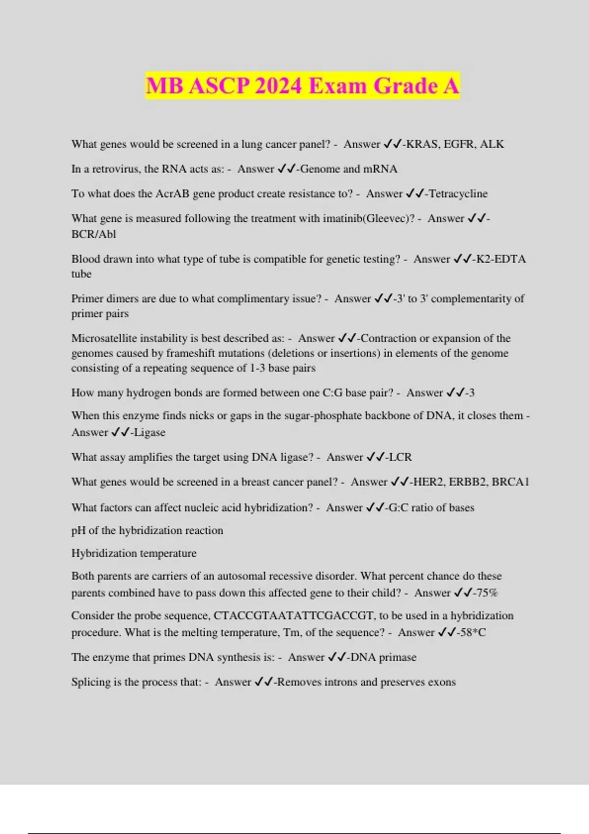 MB ASCP 2024 Exam Grade A What genes would be screened in a lung cancer panel? - Answer ️️ -KRAS, EGFR, ALK In a retrovirus, the RNA acts as: - Answer ️️ -Genome and mRNA To what does the AcrAB gene product create resistance to? - Answer ️️ -Tetracycline What gene is measured following the treatment with imatinib(Gleevec)? - Answer ️️ - BCR/Abl Blood drawn into what type of tube is compatible for genetic testing? - Answer ️️ -K2-EDTA tube Primer dimers are due to what complimentary issue? - Answer ️️ -3' to 3' complementarity of primer pairs Microsatellite instability is best described as: - Answer ️️ -Contraction or expansion of the genomes caused by frameshift mutations (deletions or insertions) in elements of the genome consisting of a repeating sequence of 1-3 base pairs How many hydrogen bonds are formed between one C:G base pair? - Answer ️️ -3 When this enzyme finds nicks or gaps in the sugar-phosphate backbone of DNA, it closes them - Answer ️️ -Ligase What assay amplifies the target using DNA ligase? - Answer ️️ -LCR What genes would be screened in a breast cancer panel? - Answer ️️ -HER2, ERBB2, BRCA1 What factors can affect nucleic acid hybridization? - Answer ️️ -G:C ratio of bases pH of the hybridization reaction Hybridization temperature Both parents are carriers of an autosomal recessive disorder. What percent chance do these parents combined have to pass down this affected gene to their child? - Answer ️️ -75% Consider the probe sequence, CTACCGTAATATTCGACCGT, to be used in a hybridization procedure. What is the melting temperature, Tm, of the sequence? - Answer ️️ -58*C The enzyme that primes DNA synthesis is: - Answer ️️ -DNA primase Splicing is the process that: - Answer ️️ -Removes introns and preserves exons All of the following enzymes are part of the DNA replication machinery - Answer ️️ -Ligase, DNA polymerase, Helicase This translocation creates a fusion protein between the Abl1 gene on one chromosome and the BCR gene on the other chromosome, resulting in chronic myelogenous leukemia (CML): - Answer ️️ -t(9;22) Given the anti-sense strand of DNA: 5'-AATTGCCGACATAGAT-3' which is the appropriate sense strand? - Answer ️️ -5'-ATCTATGTCGGCAATT-3' All of the following methods of amplification are considered target amplification: - Answer ️️ -Quantitative PCR Strand Displacement Amplification Reverse Transcriptase PCR What stain binds to minor groove of DNA Duplex? - Answer ️️ -SYBR1 The purines are: - Answer ️️ -Adenine and guanine Purines and pyrimidines differ from each other in that: - Answer ️️ -Purines have two rings; pyrimidines have one ring What gene is measured following treatment with Warfarin? - Answer ️️ -VKORC1 According to Chargaff's rule of base pairing, adenine pairs with: - Answer ️️ -Thymine When comparing 2 samples in a qPCR Amplification plot, a log difference can be seen as approximately: - Answer ️️ -ΔCt = 3.3 The process of making RNA is termed: - Answer ️️ -Transcription When sequencing HLA-DR what is targeted? - Answer ️️ -Exon 2 of the β subunit All of the following are components of nucleic acids: - Answer ️️ -Phosphate group Sugar (ribose or deoxyribose) Nitrogenous base (A,C,G,T) Branched DNA amplification (bDNA) is best classified as: - Answer ️️ -Signal amplification This PCR method works by generating a signal at the annealing step (i.e. when the probe binds its target) of the PCR reaction: - Answer ️️ -Molecular beacons What is the predominant form of DNA? - Answer ️️ -B form Mantle cell lymphoma (MCL) is caused by what translocation? - Answ