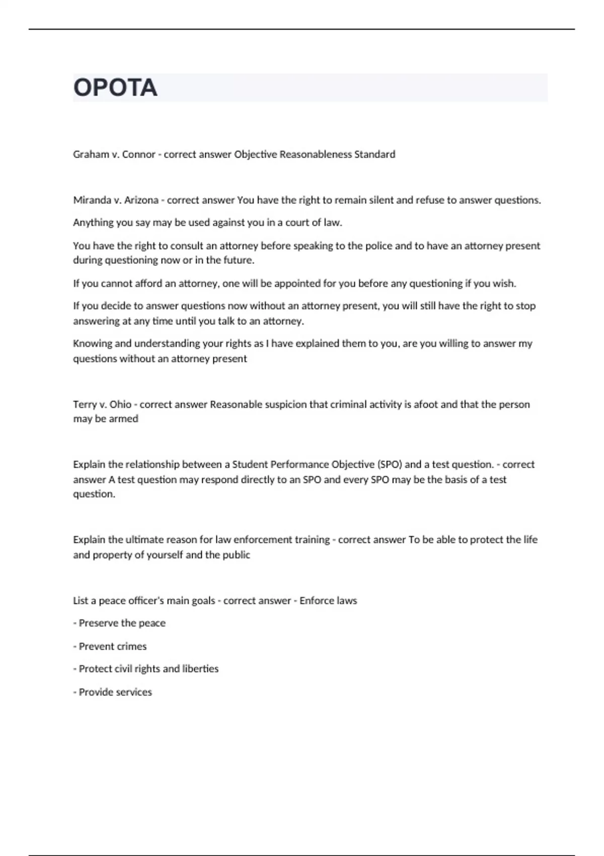 OPOTAGraham v. Connor - correct answer Objective Reasonableness Standard Miranda v. Arizona - correct answer You have the right to remain silent and refuse to answer questions. Anything you say may be used against you in a court of law. You have the right to consult an attorney before speaking to the police and to have an attorney present during questioning now or in the future. If you cannot afford an attorney, one will be appointed for you before any questioning if you wish. If you decide to answer questions now without an attorney present, you will still have the right to stop answering at any time until you talk to an attorney. Knowing and understanding your rights as I have explained them to you, are you willing to answer my questions without an attorney present Terry v. Ohio - correct answer Reasonable suspicion that criminal activity is afoot and that the person may be armed Explain the relationship between a Student Performance Objective (SPO) and a test question. - correct answer A test question may respond directly to an SPO and every SPO may be the basis of a test question. Explain the ultimate reason for law enforcement training - correct answer To be able to protect the life and property of yourself and the public List a peace officer's main goals - correct answer - Enforce laws - Preserve the peace - Prevent crimes - Protect civil rights and liberties - Provide services