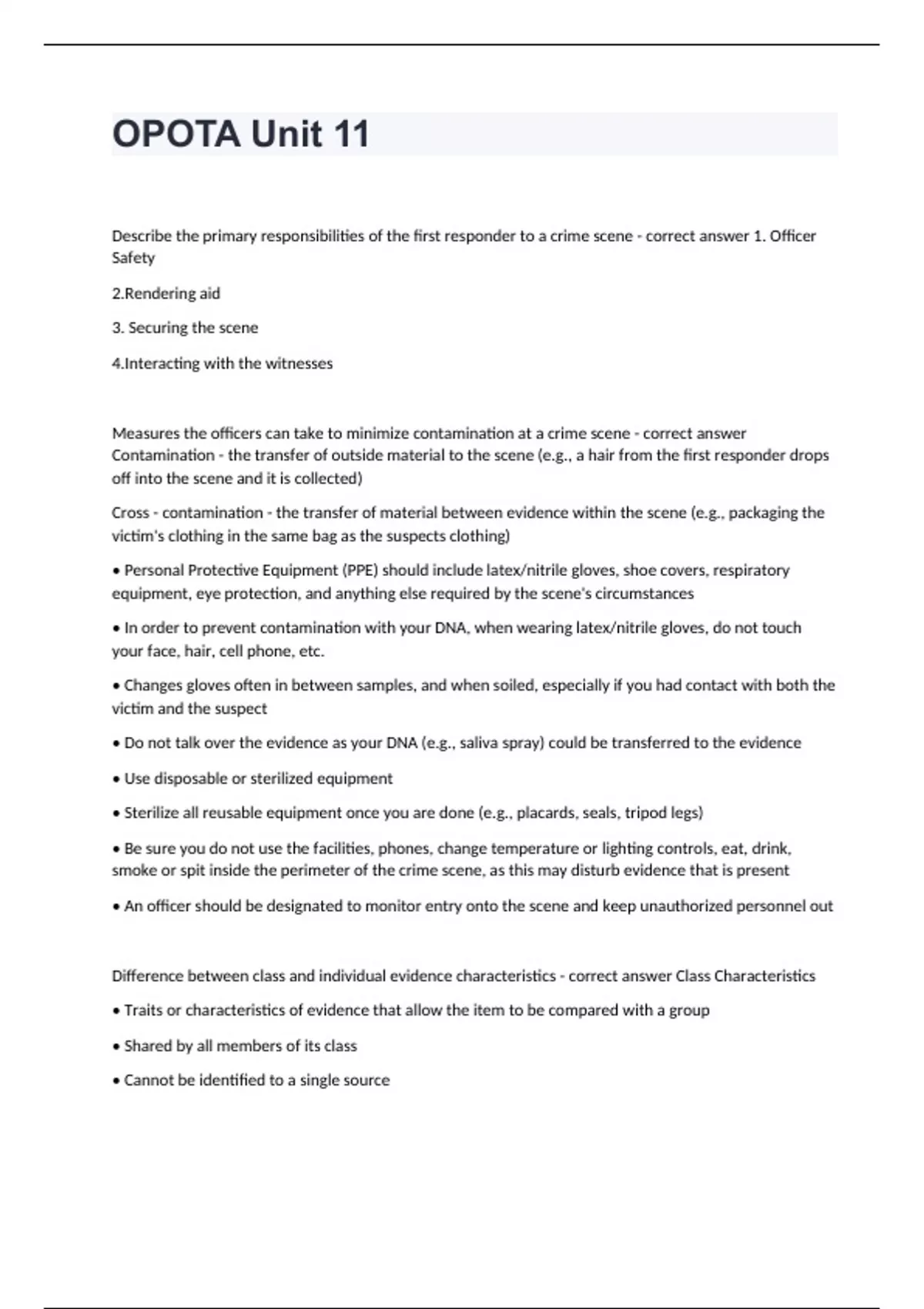 OPOTA Unit 11Describe the primary responsibilities of the first responder to a crime scene - correct answer 1. Officer Safety 2.Rendering aid 3. Securing the scene 4.Interacting with the witnesses Measures the officers can take to minimize contamination at a crime scene - correct answer Contamination - the transfer of outside material to the scene (e.g., a hair from the first responder drops off into the scene and it is collected) Cross - contamination - the transfer of material between evidence within the scene (e.g., packaging the victim's clothing in the same bag as the suspects clothing) • Personal Protective Equipment (PPE) should include latex/nitrile gloves, shoe covers, respiratory equipment, eye protection, and anything else required by the scene's circumstances • In order to prevent contamination with your DNA, when wearing latex/nitrile gloves, do not touch your face, hair, cell phone, etc. • Changes gloves often in between samples, and when soiled, especially if you had contact with both the victim and the suspect • Do not talk over the evidence as your DNA (e.g., saliva spray) could be transferred to the evidence • Use disposable or sterilized equipment • Sterilize all reusable equipment once you are done (e.g., placards, seals, tripod legs) • Be sure you do not use the facilities, phones, change temperature or lighting controls, eat, drink, smoke or spit inside the perimeter of the crime scene, as this may disturb evidence that is present • An officer should be designated to monitor entry onto the scene and keep unauthorized personnel out Difference between class and individual evidence characteristics - correct answer Class Characteristics • Traits or characteristics of evidence that allow the item to be compared with a group • Shared by all members of its class • Cannot be identified to a single source