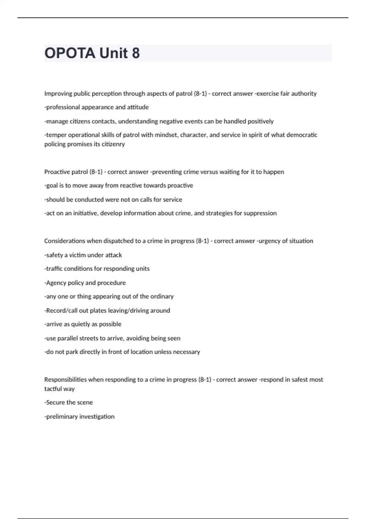 OPOTA Unit 8Improving public perception through aspects of patrol (8-1) - correct answer -exercise fair authority -professional appearance and attitude -manage citizens contacts, understanding negative events can be handled positively -temper operational skills of patrol with mindset, character, and service in spirit of what democratic policing promises its citizenry Proactive patrol (8-1) - correct answer -preventing crime versus waiting for it to happen -goal is to move away from reactive towards proactive -should be conducted were not on calls for service -act on an initiative, develop information about crime, and strategies for suppression Considerations when dispatched to a crime in progress (8-1) - correct answer -urgency of situation -safety a victim under attack -traffic conditions for responding units -Agency policy and procedure -any one or thing appearing out of the ordinary -Record/call out plates leaving/driving around -arrive as quietly as possible -use parallel streets to arrive, avoiding being seen -do not park directly in front of location unless necessary Responsibilities when responding to a crime in progress (8-1) - correct answer -respond in safest most tactful way -Secure the scene -preliminary investigation