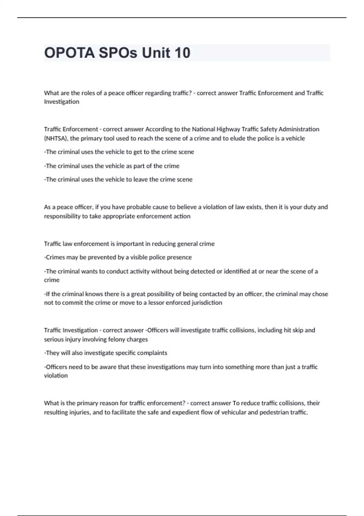OPOTA SPOs Unit 10 What are the roles of a peace officer regarding traffic? - correct answer Traffic Enforcement and Traffic Investigation Traffic Enforcement - correct answer According to the National Highway Traffic Safety Administration (NHTSA), the primary tool used to reach the scene of a crime and to elude the police is a vehicle -The criminal uses the vehicle to get to the crime scene -The criminal uses the vehicle as part of the crime -The criminal uses the vehicle to leave the crime scene As a peace officer, if you have probable cause to believe a violation of law exists, then it is your duty and responsibility to take appropriate enforcement action Traffic law enforcement is important in reducing general crime -Crimes may be prevented by a visible police presence -The criminal wants to conduct activity without being detected or identified at or near the scene of a crime -If the criminal knows there is a great possibility of being contacted by an officer, the criminal may chose not to commit the crime or move to a lessor enforced jurisdiction Traffic Investigation - correct answer -Officers will investigate traffic collisions, including hit skip and serious injury involving felony charges -They will also investigate specific complaints -Officers need to be aware that these investigations may turn into something more than just a traffic violation What is the primary reason for traffic enforcement? - correct answer To reduce traffic collisions, their resulting injuries, and to facilitate the safe and expedient flow of vehicular and pedestrian traffic.
