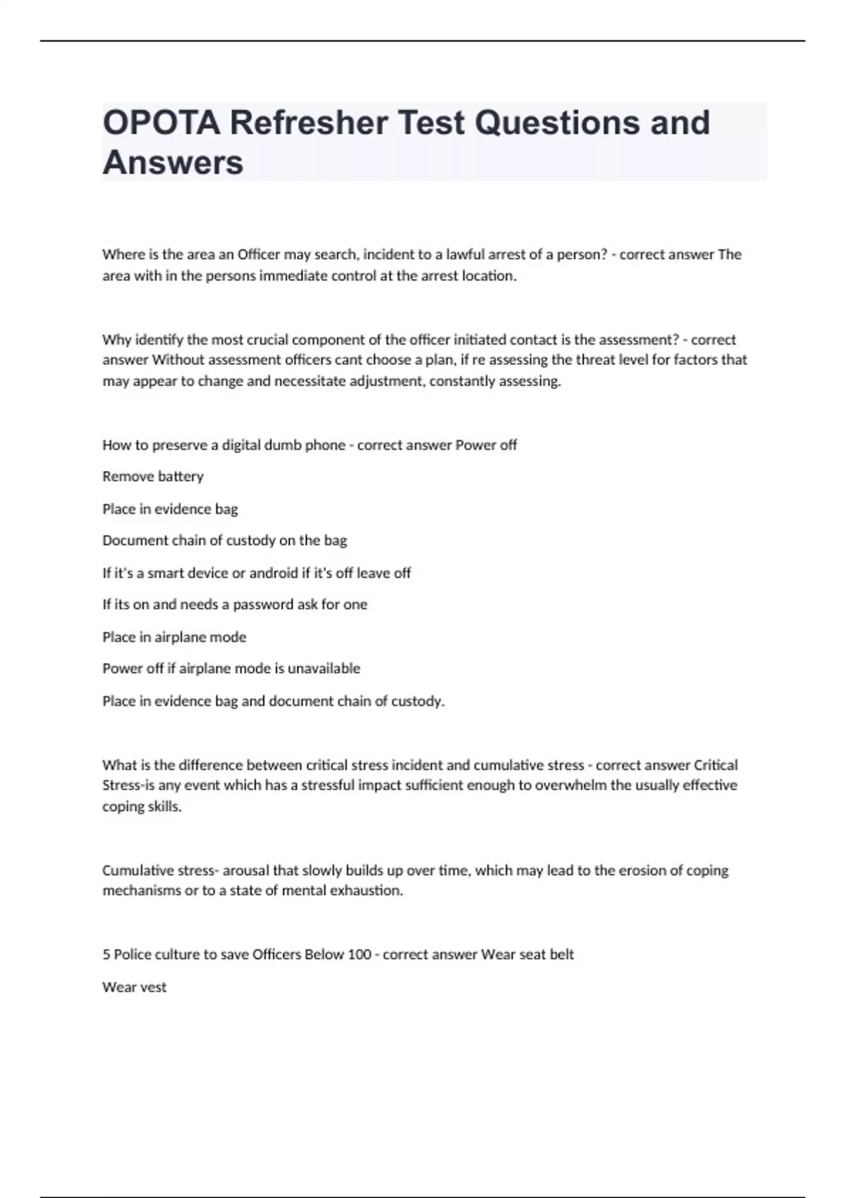 OPOTA Refresher Test Questions and AnswersWhere is the area an Officer may search, incident to a lawful arrest of a person? - correct answer The area with in the persons immediate control at the arrest location. Why identify the most crucial component of the officer initiated contact is the assessment? - correct answer Without assessment officers cant choose a plan, if re assessing the threat level for factors that may appear to change and necessitate adjustment, constantly assessing. How to preserve a digital dumb phone - correct answer Power off Remove battery Place in evidence bag Document chain of custody on the bag If it's a smart device or android if it's off leave off If its on and needs a password ask for one Place in airplane mode Power off if airplane mode is unavailable Place in evidence bag and document chain of custody. What is the difference between critical stress incident and cumulative stress - correct answer Critical Stress-is any event which has a stressful impact sufficient enough to overwhelm the usually effective coping skills. Cumulative stress- arousal that slowly builds up over time, which may lead to the erosion of coping mechanisms or to a state of mental exhaustion. 5 Police culture to save Officers Below 100 - correct answer Wear seat belt Wear vest