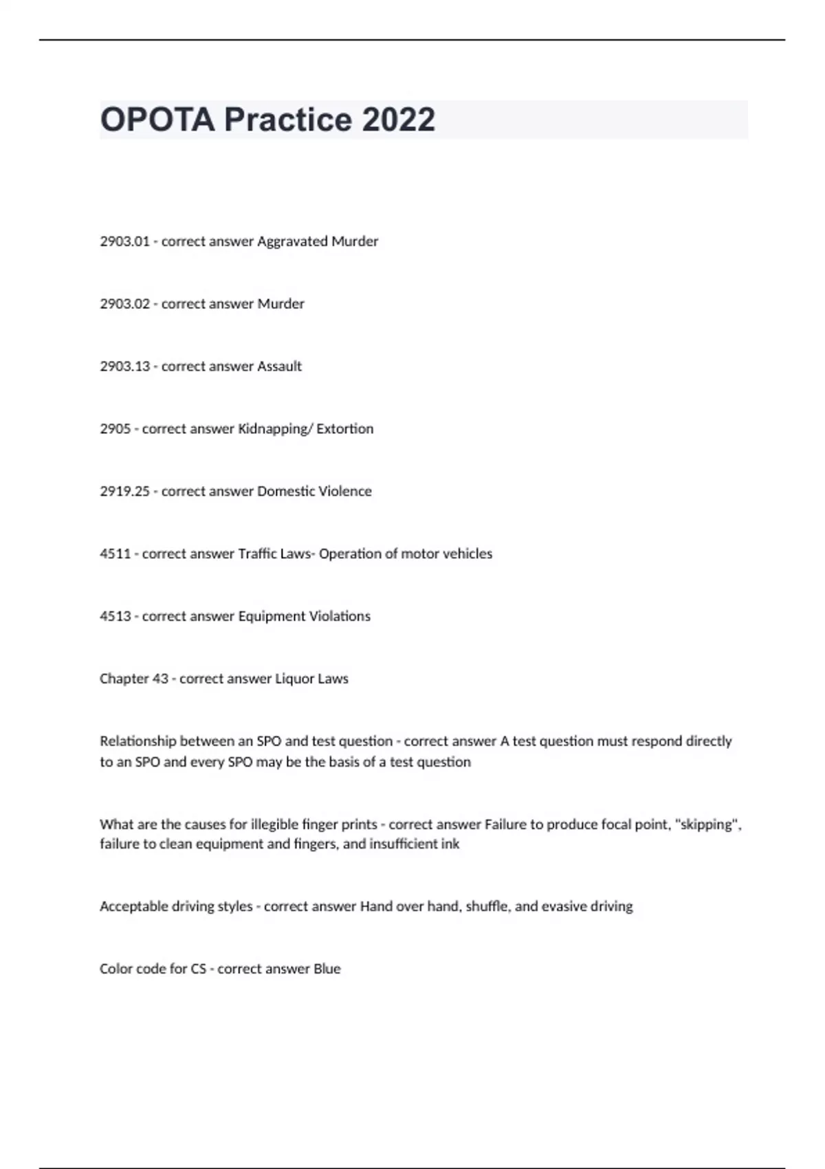 OPOTA Practice 2022 2903.01 - correct answer Aggravated Murder 2903.02 - correct answer Murder 2903.13 - correct answer Assault 2905 - correct answer Kidnapping/ Extortion 2919.25 - correct answer Domestic Violence 4511 - correct answer Traffic Laws- Operation of motor vehicles 4513 - correct answer Equipment Violations Chapter 43 - correct answer Liquor Laws Relationship between an SPO and test question - correct answer A test question must respond directly to an SPO and every SPO may be the basis of a test question What are the causes for illegible finger prints - correct answer Failure to produce focal point, "skipping", failure to clean equipment and fingers, and insufficient ink Acceptable driving styles - correct answer Hand over hand, shuffle, and evasive driving Color code for CS - correct answer Blue