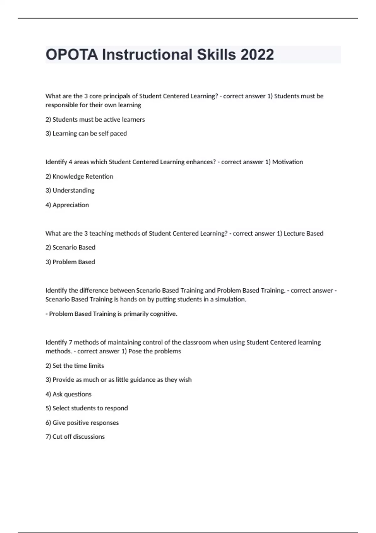 OPOTA Instructional Skills 2022 What are the 3 core principals of Student Centered Learning? - correct answer 1) Students must be responsible for their own learning 2) Students must be active learners 3) Learning can be self paced Identify 4 areas which Student Centered Learning enhances? - correct answer 1) Motivation 2) Knowledge Retention 3) Understanding 4) Appreciation What are the 3 teaching methods of Student Centered Learning? - correct answer 1) Lecture Based 2) Scenario Based 3) Problem Based Identify the difference between Scenario Based Training and Problem Based Training. - correct answer - Scenario Based Training is hands on by putting students in a simulation. - Problem Based Training is primarily cognitive. Identify 7 methods of maintaining control of the classroom when using Student Centered learning methods. - correct answer 1) Pose the problems 2) Set the time limits 3) Provide as much or as little guidance as they wish 4) Ask questions 5) Select students to respond 6) Give positive responses 7) Cut off discussions What is the ultimate goal as a facilitator? - correct answer To help learning occur