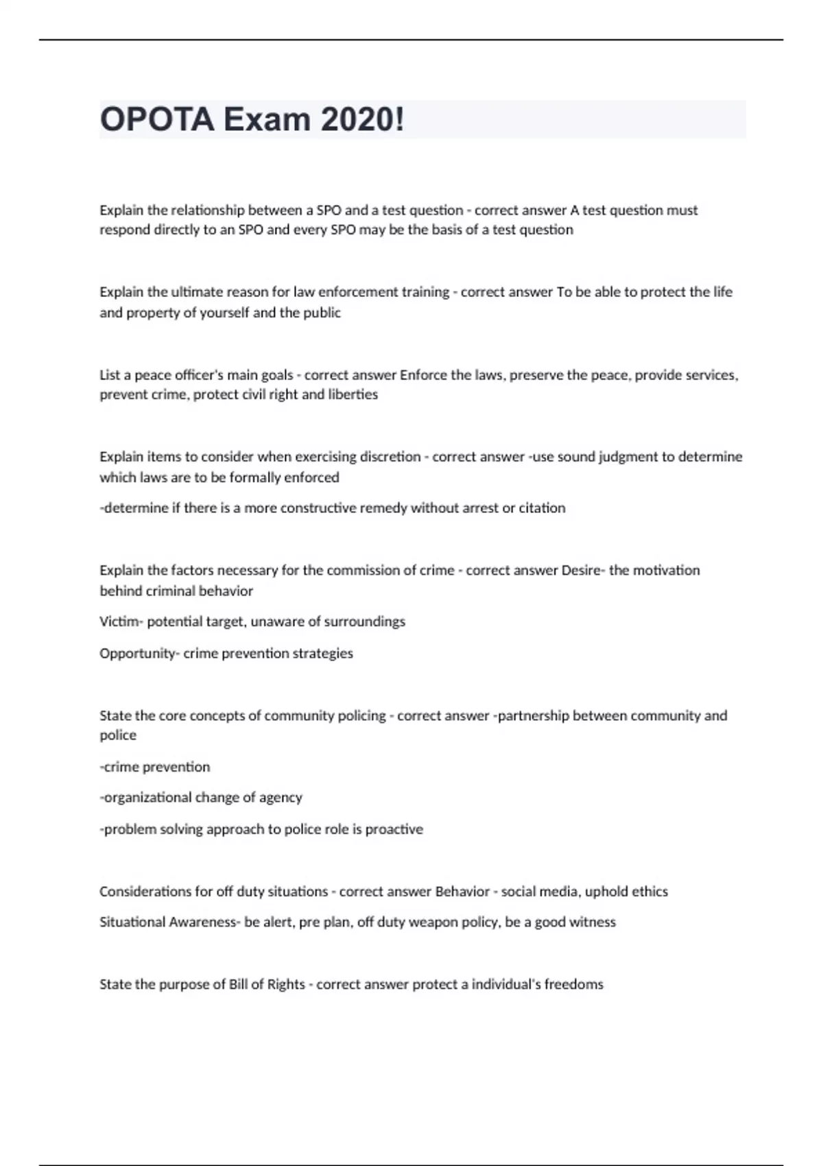 OPOTA Exam 2020!Explain the relationship between a SPO and a test question - correct answer A test question must respond directly to an SPO and every SPO may be the basis of a test question Explain the ultimate reason for law enforcement training - correct answer To be able to protect the life and property of yourself and the public List a peace officer's main goals - correct answer Enforce the laws, preserve the peace, provide services, prevent crime, protect civil right and liberties Explain items to consider when exercising discretion - correct answer -use sound judgment to determine which laws are to be formally enforced -determine if there is a more constructive remedy without arrest or citation Explain the factors necessary for the commission of crime - correct answer Desire- the motivation behind criminal behavior Victim- potential target, unaware of surroundings Opportunity- crime prevention strategies State the core concepts of community policing - correct answer -partnership between community and police -crime prevention -organizational change of agency -problem solving approach to police role is proactive Considerations for off duty situations - correct answer Behavior - social media, uphold ethics Situational Awareness- be alert, pre plan, off duty weapon policy, be a good witness State the purpose of Bill of Rights - correct answer protect a individual's freedoms