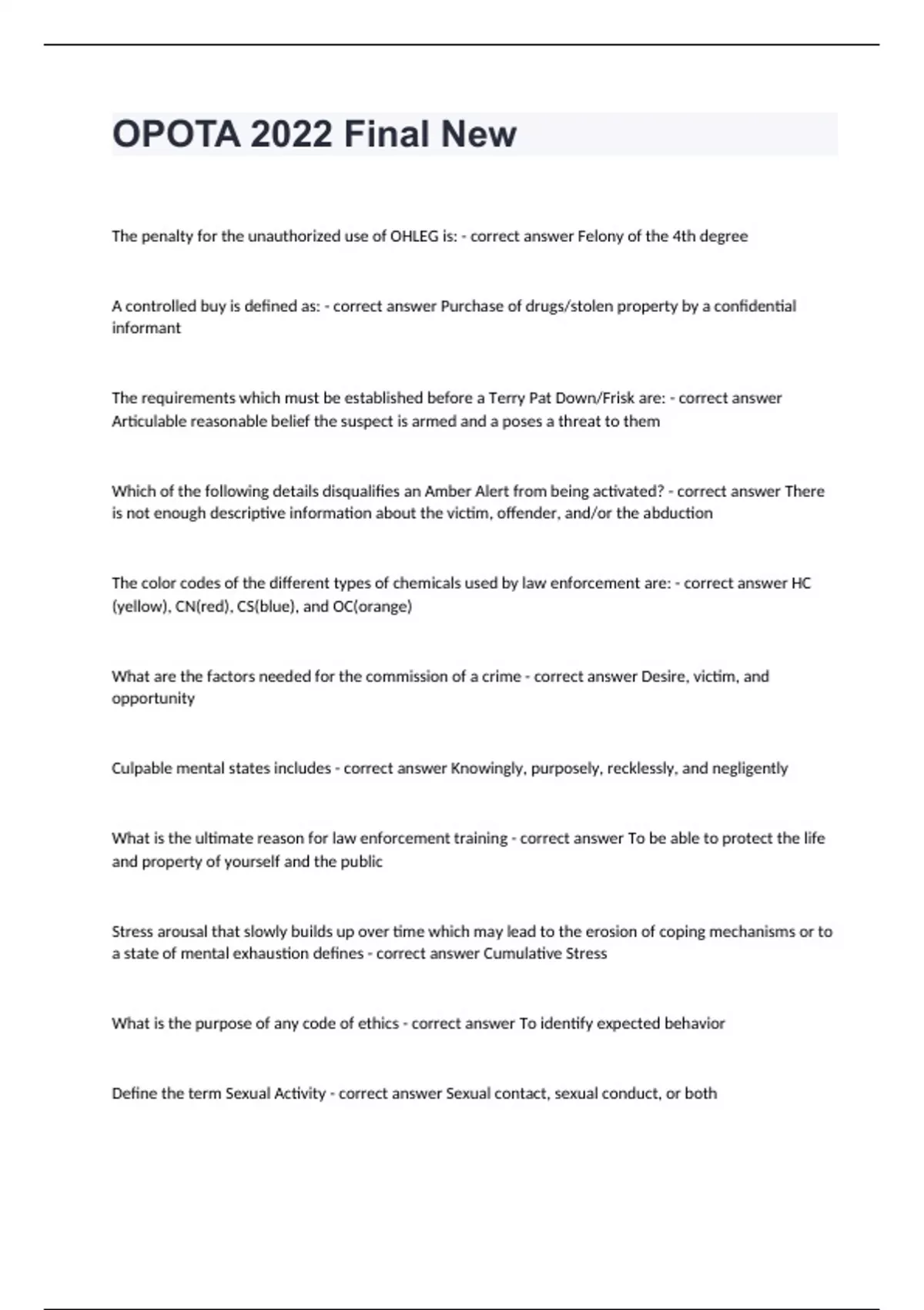 OPOTA 2022 Final New The penalty for the unauthorized use of OHLEG is: - correct answer Felony of the 4th degree A controlled buy is defined as: - correct answer Purchase of drugs/stolen property by a confidential informant The requirements which must be established before a Terry Pat Down/Frisk are: - correct answer Articulable reasonable belief the suspect is armed and a poses a threat to them Which of the following details disqualifies an Amber Alert from being activated? - correct answer There is not enough descriptive information about the victim, offender, and/or the abduction The color codes of the different types of chemicals used by law enforcement are: - correct answer HC (yellow), CN(red), CS(blue), and OC(orange) What are the factors needed for the commission of a crime - correct answer Desire, victim, and opportunity Culpable mental states includes - correct answer Knowingly, purposely, recklessly, and negligently What is the ultimate reason for law enforcement training - correct answer To be able to protect the life and property of yourself and the public Stress arousal that slowly builds up over time which may lead to the erosion of coping mechanisms or to a state of mental exhaustion defines - correct answer Cumulative Stress What is the purpose of any code of ethics - correct answer To identify expected behavior Define the term Sexual Activity - correct answer Sexual contact, sexual conduct, or both By force, stealth, or deception trespass in an occupied structure or in a separately secured or separately occupied portion of an occupied structure when any person is present or likely to be present, with purpose to commit in the habitation - correct answer Breaking and Entering Which is NOT a major category of police related lawsuits - correct answer Bogus Reports Which is NOT one of the four main factors to consider when determining what level of force is reasonably justified - correct answer Whether the suspect is passively resisting Be early. Be professional. Wear uniform or business attire. Speak loudly, clearly, and with confidence. Give concise, clear, and complete answers. Avoid talking with potential or actual jurors. What are these general rules for - correct answer Effective Courtroom Testimony What are the common needs most victims have after a crime has been committed - correct answer Safety, Healing, Justice, and Restitution Why is the Computerized Criminal History (CCH) one of the most sensitive files accessed by LEADS - correct answer This file contains criminal histories of individuals in Ohio. Information is stored in the CCH file on all arrests and adjudications of individuals in the state, whether those individuals are residents of Ohio or not Identify how the Ohio Law Enforcement Gateway is to be utilized - correct answer For law enforcement purposes only and not for personal use or gain What are a peace officer's main goals - correct answer Enforce laws, preserve peace, prevent crimes, protect civil rights and liberties, provide services Which of the following is NOT a consideration for Off duty situations - correct answer To protect and serve the community What is the purpose of the Bill of Rights - correct answer To prevent the government from interfering in individual freedoms