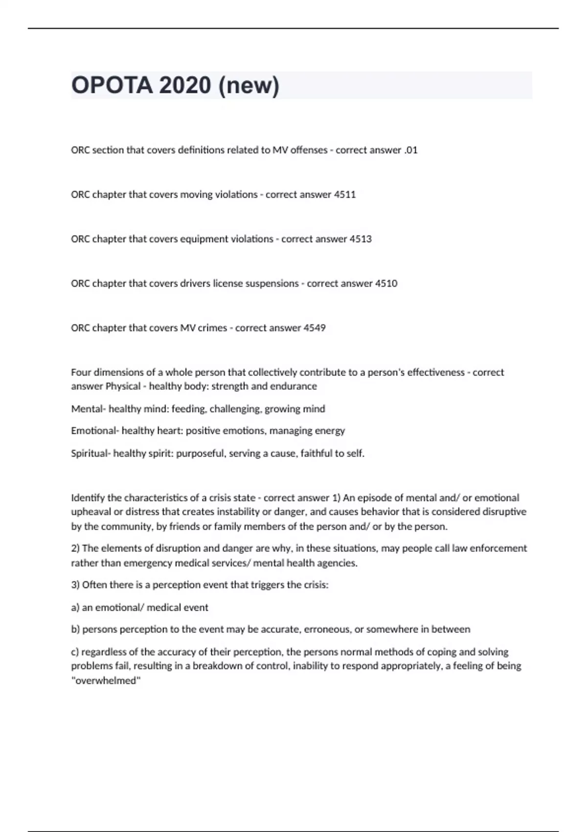 OPOTA 2020 (new) ORC section that covers definitions related to MV offenses - correct answer .01 ORC chapter that covers moving violations - correct answer 4511 ORC chapter that covers equipment violations - correct answer 4513 ORC chapter that covers drivers license suspensions - correct answer 4510 ORC chapter that covers MV crimes - correct answer 4549 Four dimensions of a whole person that collectively contribute to a person's effectiveness - correct answer Physical - healthy body: strength and endurance Mental- healthy mind: feeding, challenging, growing mind Emotional- healthy heart: positive emotions, managing energy Spiritual- healthy spirit: purposeful, serving a cause, faithful to self. Identify the characteristics of a crisis state - correct answer 1) An episode of mental and/ or emotional upheaval or distress that creates instability or danger, and causes behavior that is considered disruptive by the community, by friends or family members of the person and/ or by the person. 2) The elements of disruption and danger are why, in these situations, may people call law enforcement rather than emergency medical services/ mental health agencies. 3) Often there is a perception event that triggers the crisis: a) an emotional/ medical event b) persons perception to the event may be accurate, erroneous, or somewhere in between c) regardless of the accuracy of their perception, the persons normal methods of coping and solving problems fail, resulting in a breakdown of control, inability to respond appropriately, a feeling of being "overwhelmed"