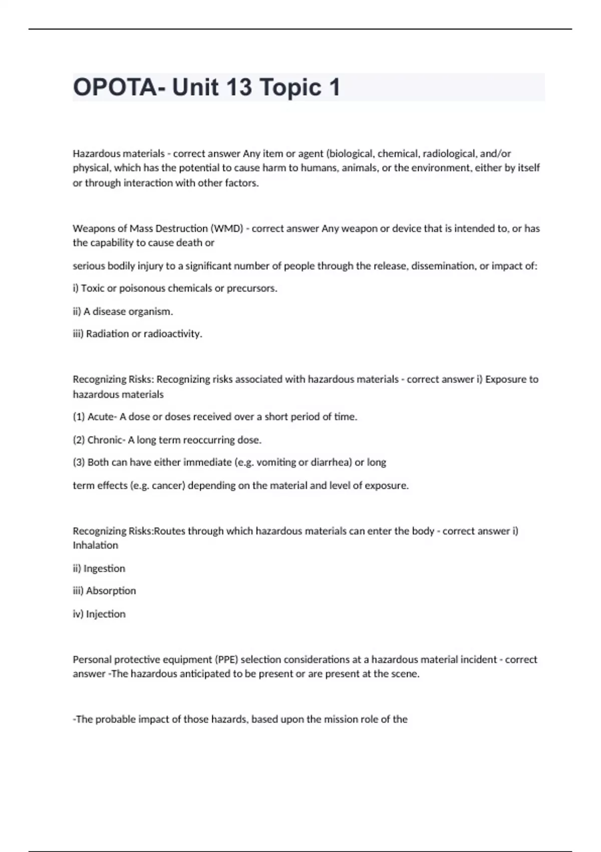 OPOTA- Unit 13 Topic 1 Hazardous materials - correct answer Any item or agent (biological, chemical, radiological, and/or physical, which has the potential to cause harm to humans, animals, or the environment, either by itself or through interaction with other factors. Weapons of Mass Destruction (WMD) - correct answer Any weapon or device that is intended to, or has the capability to cause death or serious bodily injury to a significant number of people through the release, dissemination, or impact of: i) Toxic or poisonous chemicals or precursors. ii) A disease organism. iii) Radiation or radioactivity. Recognizing Risks: Recognizing risks associated with hazardous materials - correct answer i) Exposure to hazardous materials (1) Acute- A dose or doses received over a short period of time. (2) Chronic- A long term reoccurring dose. (3) Both can have either immediate (e.g. vomiting or diarrhea) or long term effects (e.g. cancer) depending on the material and level of exposure. Recognizing Risks:Routes through which hazardous materials can enter the body - correct answer i) Inhalation ii) Ingestion iii) Absorption iv) Injection Personal protective equipment (PPE) selection considerations at a hazardous material incident - correct answer -The hazardous anticipated to be present or are present at the scene. -The probable impact of those hazards, based upon the mission role of the