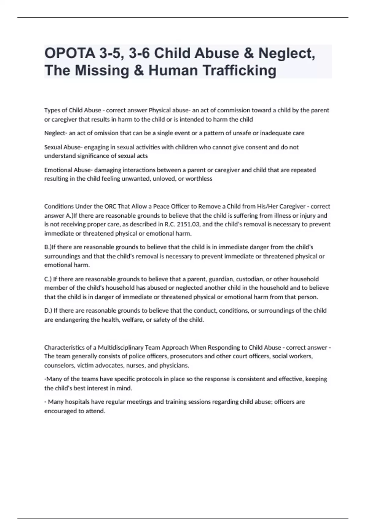 OPOTA 3-5, 3-6 Child Abuse & Neglect, The Missing & Human TraffickingTypes of Child Abuse - correct answer Physical abuse- an act of commission toward a child by the parent or caregiver that results in harm to the child or is intended to harm the child Neglect- an act of omission that can be a single event or a pattern of unsafe or inadequate care Sexual Abuse- engaging in sexual activities with children who cannot give consent and do not understand significance of sexual acts Emotional Abuse- damaging interactions between a parent or caregiver and child that are repeated resulting in the child feeling unwanted, unloved, or worthless Conditions Under the ORC That Allow a Peace Officer to Remove a Child from His/Her Caregiver - correct answer A.)If there are reasonable grounds to believe that the child is suffering from illness or injury and is not receiving proper care, as described in R.C. 2151.03, and the child's removal is necessary to prevent immediate or threatened physical or emotional harm. B.)If there are reasonable grounds to believe that the child is in immediate danger from the child's surroundings and that the child's removal is necessary to prevent immediate or threatened physical or emotional harm. C.) If there are reasonable grounds to believe that a parent, guardian, custodian, or other household member of the child's household has abused or neglected another child in the household and to believe that the child is in danger of immediate or threatened physical or emotional harm from that person. D.) If there are reasonable grounds to believe that the conduct, conditions, or surroundings of the child are endangering the health, welfare, or safety of the child. Characteristics of a Multidisciplinary Team Approach When Responding to Child Abuse - correct answer -The team generally consists of police officers, prosecutors and other court officers, social workers, counselors, victim advocates, nurses, and physicians. -Many of the teams have specific protocols in place so the response is consistent and effective, keeping the child's best interest in mind. - Many hospitals have regular meetings and training sessions regarding child abuse; officers are encouraged to attend. -Several jurisdictions have a child advocacy center (CAC) where the interdisciplinary team meets regularly to conduct child interviews, and make joint decisions about the investigation, treatment, management, and prosecution of abuse cases. Responsibilities of a Law Enforcement Agency in a Missing Child Case - correct answer 1.) Take prompt actions to locate the missing child 2.) Understand there is no waiting period before a child can be reported missing 3.) Immediately enter the information into NCIC 4.) Notify neighboring agencies 5.) Remove entry from NCIC if child is found Actions the the Initial Officer Assigned to the Report of a Missing Child Will Take - correct answer -conduct a preliminary interview of the person making the report -verify the child is missing What the Officer Should Do if the Initial Investigation is Completed and the Child is Still Missing - correct answer Reach out to additional resources Categories of Missing Children - correct answer -Non-family abduction -Family abduction - Runaways/ throwaways -Lost/ injured/ otherwise missing (LIM) Information an Officer Should Gather During a Preliminary Interview in a Family Abduction Missing Child Case - correct answer -determine who has custody rights -confirm the suspected family member as the actual abductor -establish the intent of the abductor -ask additional questions Why the Closure Stage Provides an Important Opportunity For Law Enforcement - correct answer To learn not only about how the runaway survived but to investigate if other crimes were being committed at home that may have caused the child to run