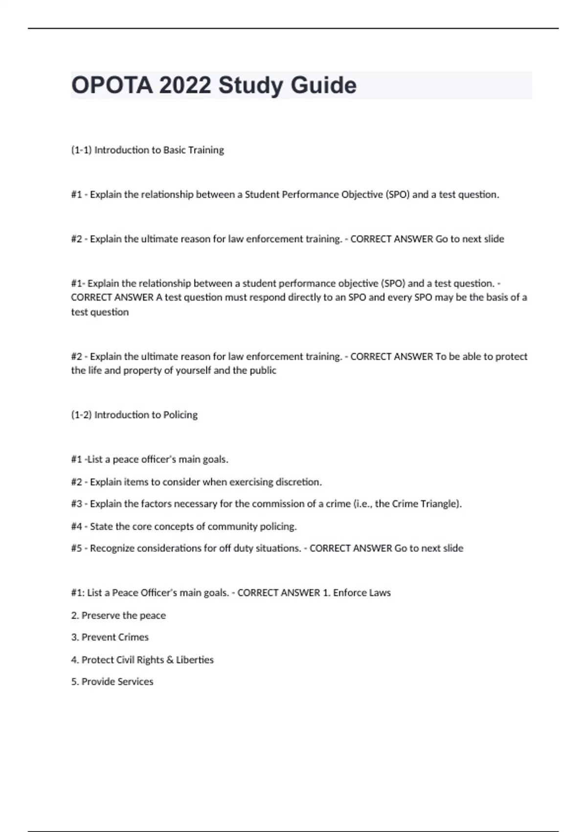 OPOTA 2022 Study Guide(1-1) Introduction to Basic Training #1 - Explain the relationship between a Student Performance Objective (SPO) and a test question. #2 - Explain the ultimate reason for law enforcement training. - CORRECT ANSWER Go to next slide #1- Explain the relationship between a student performance objective (SPO) and a test question. - CORRECT ANSWER A test question must respond directly to an SPO and every SPO may be the basis of a test question #2 - Explain the ultimate reason for law enforcement training. - CORRECT ANSWER To be able to protect the life and property of yourself and the public (1-2) Introduction to Policing #1 -List a peace officer's main goals. #2 - Explain items to consider when exercising discretion. #3 - Explain the factors necessary for the commission of a crime (i.e., the Crime Triangle). #4 - State the core concepts of community policing. #5 - Recognize considerations for off duty situations. - CORRECT ANSWER Go to next slide #1: List a Peace Officer's main goals. - CORRECT ANSWER 1. Enforce Laws 2. Preserve the peace 3. Prevent Crimes 4. Protect Civil Rights & Liberties 5. Provide Services