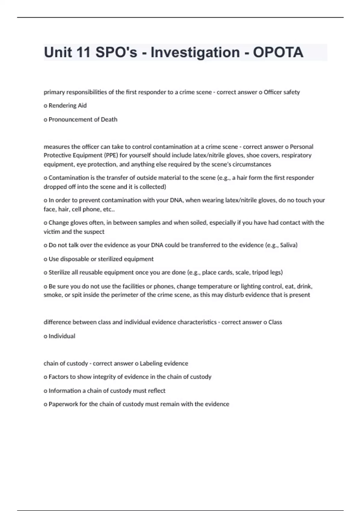 Unit 11 SPO's - Investigation - OPOTAprimary responsibilities of the first responder to a crime scene - correct answer o Officer safety o Rendering Aid o Pronouncement of Death measures the officer can take to control contamination at a crime scene - correct answer o Personal Protective Equipment (PPE) for yourself should include latex/nitrile gloves, shoe covers, respiratory equipment, eye protection, and anything else required by the scene's circumstances o Contamination is the transfer of outside material to the scene (e.g., a hair form the first responder dropped off into the scene and it is collected) o In order to prevent contamination with your DNA, when wearing latex/nitrile gloves, do no touch your face, hair, cell phone, etc.. o Change gloves often, in between samples and when soiled, especially if you have had contact with the victim and the suspect o Do not talk over the evidence as your DNA could be transferred to the evidence (e.g., Saliva) o Use disposable or sterilized equipment o Sterilize all reusable equipment once you are done (e.g., place cards, scale, tripod legs) o Be sure you do not use the facilities or phones, change temperature or lighting control, eat, drink, smoke, or spit inside the perimeter of the crime scene, as this may disturb evidence that is present difference between class and individual evidence characteristics - correct answer o Class o Individual chain of custody - correct answer o Labeling evidence o Factors to show integrity of evidence in the chain of custody o Information a chain of custody must reflect o Paperwork for the chain of custody must remain with the evidence