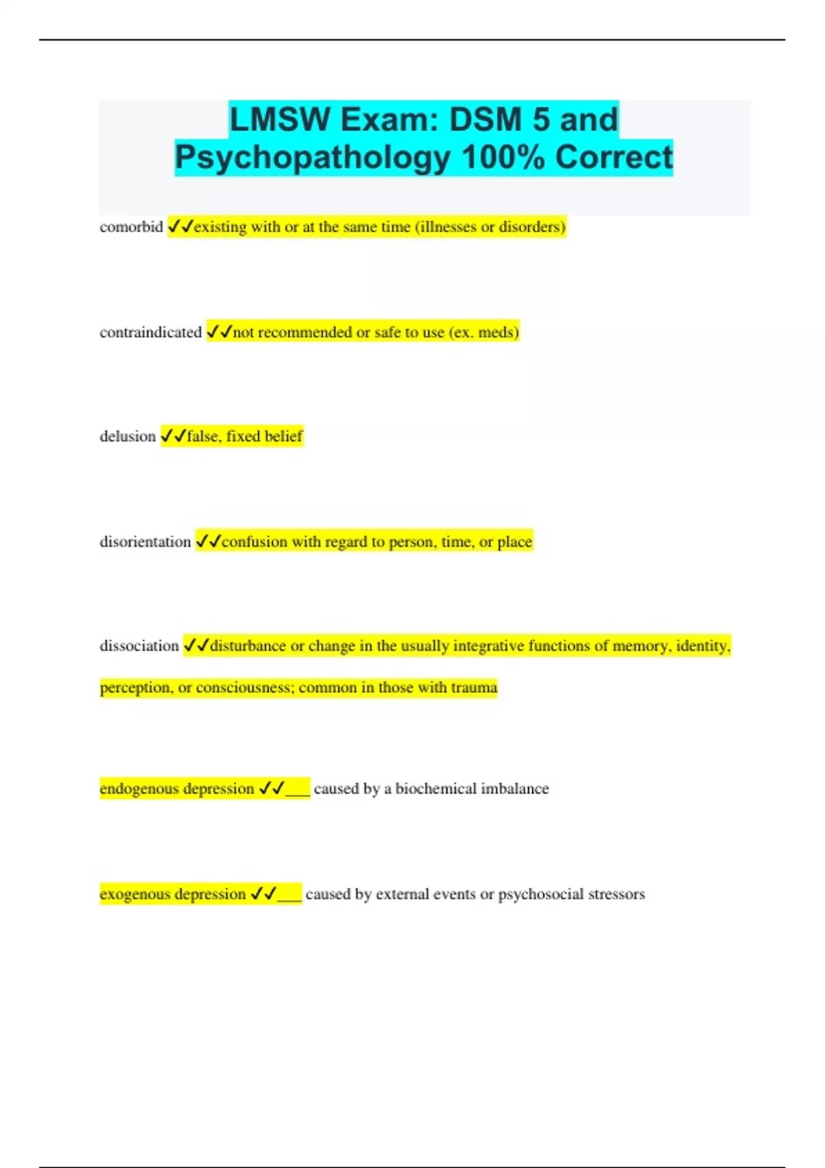 LMSW Exam: DSM 5 and Psychopathology 100% Correct