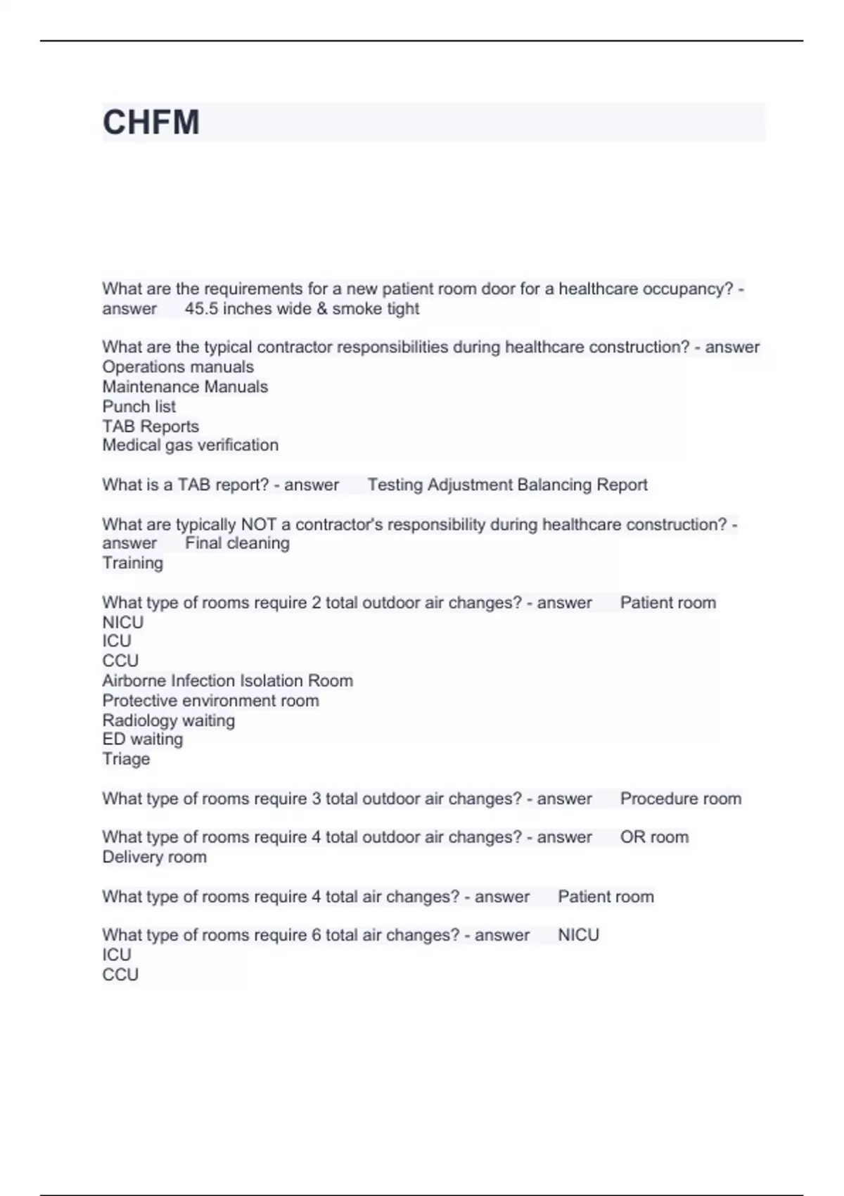CHFM QUESTIONS AND ANSWERS 2024
