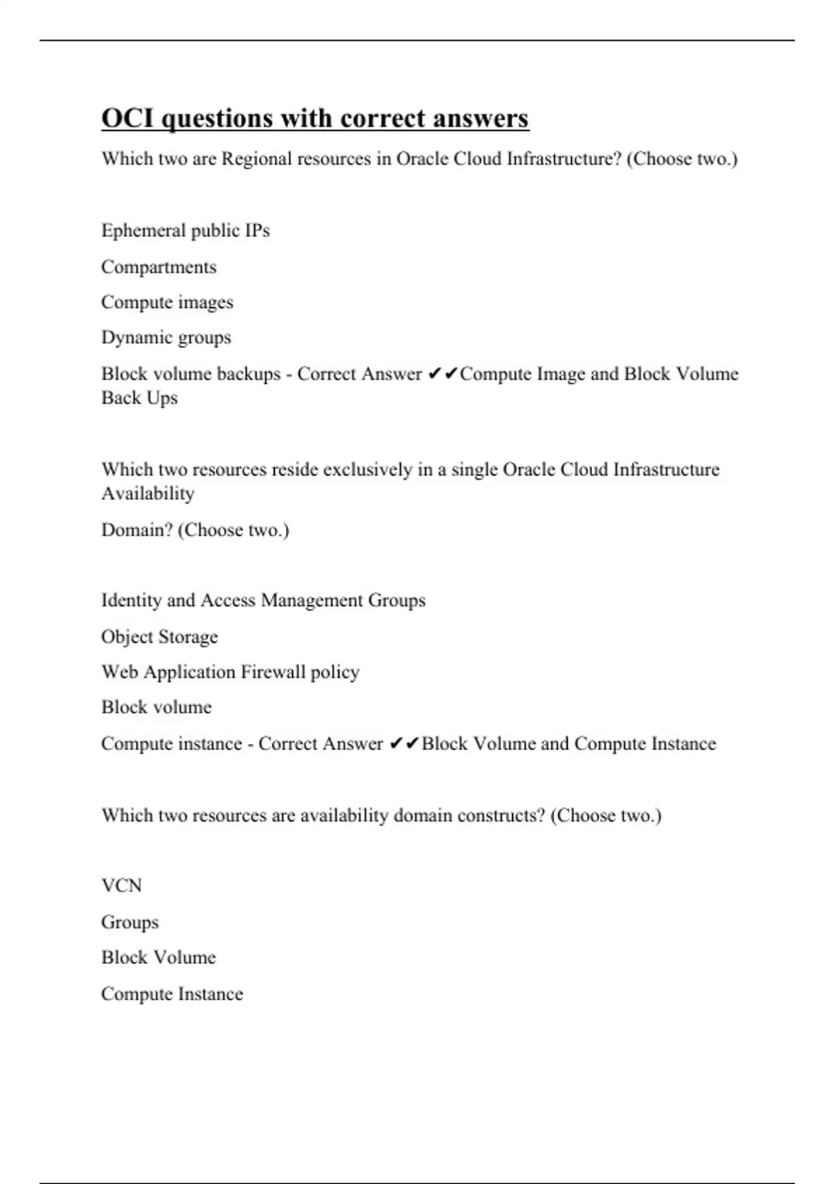 Which two are Regional resources in Oracle Cloud Infrastructure? (Choose two.) Ephemeral public IPs Compartments Compute images Dynamic groups Block volume backups - Correct Answer Compute Image and Block Volume Back Ups Which two resources reside exclusively in a single Oracle Cloud Infrastructure Availability Domain? (Choose two.) Identity and Access Management Groups Object Storage Web Application Firewall policy Block volume Compute instance - Correct Answer Block Volume and Compute Instance Which two resources are availability domain constructs? (Choose two.) VCN Groups Block Volume Compute Instance Object Storage - Correct Answer B