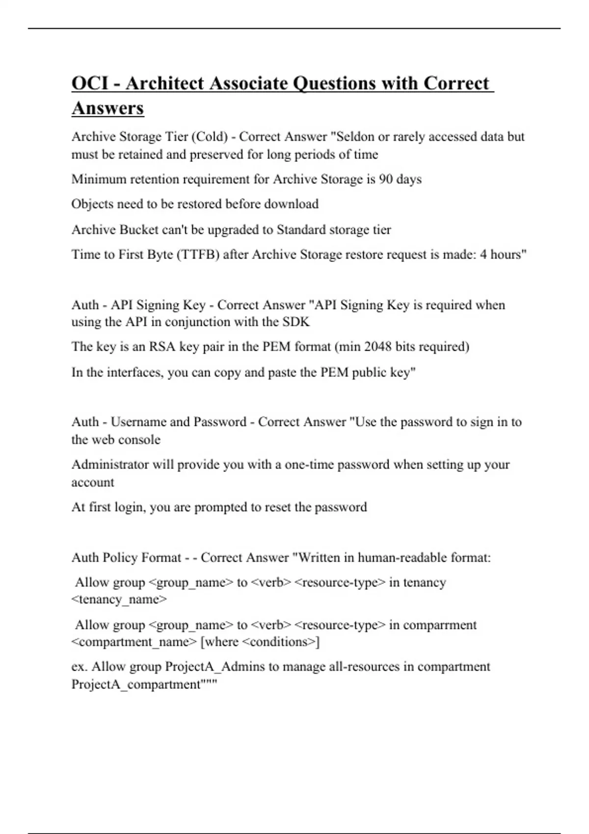 Archive Storage Tier (Cold) - Correct Answer "Seldon or rarely accessed data but must be retained and preserved for long periods of time Minimum retention requirement for Archive Storage is 90 days Objects need to be restored before download Archive Bucket can't be upgraded to Standard storage tier Time to First Byte (TTFB) after Archive Storage restore request is made: 4 hours" Auth - API Signing Key - Correct Answer "API Signing Key is required when using the API in conjunction with the SDK The key is an RSA key pair in the PEM format (min 2048 bits required) In the interfaces, you can copy and paste the PEM public key" Auth - Username and Password - Correct Answer "Use the password to sign in to the web console Administrator will provide you with a one-time password when setting up your account At first login, you are prompted to reset the password Auth Policy Format - - Correct Answer "Written in human-readable format: Allow group <group_name> to <verb> <resource-type> in tenancy <tenancy_name> Allow group <group_name> to <verb> <resource-type> in comparrment <compartment_name> [where <conditions>] ex. Allow group ProjectA_Admins to manage all-resources in compartment ProjectA_compartment"""