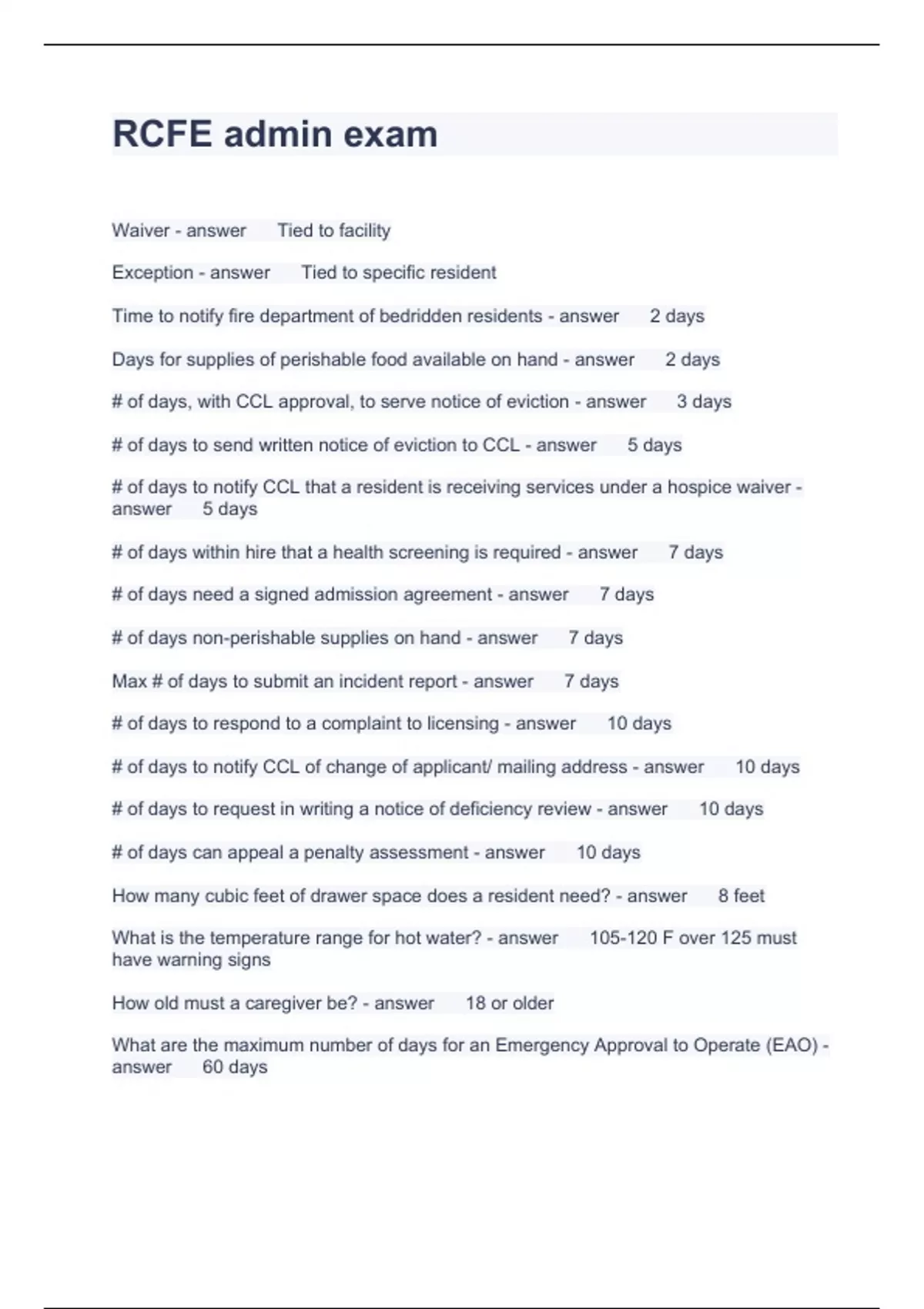 Exam of 3 pages for the course rcfe at rcfe (RCFE admin exam)