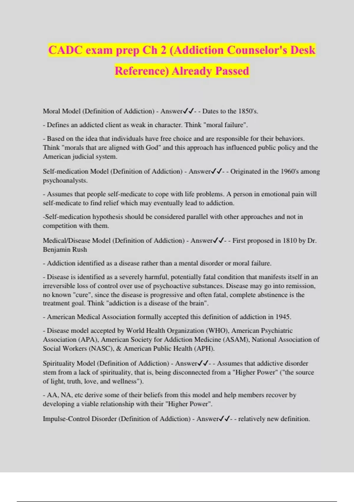 CADC exam prep Ch 2 (Addiction Counselor's Desk Reference) Already Passed Moral Model (Definition of Addiction) - Answer️️ - - Dates to the 1850's. - Defines an addicted client as weak in character. Think "moral failure". - Based on the idea that individuals have free choice and are responsible for their behaviors. Think "morals that are aligned with God" and this approach has influenced public policy and the American judicial system. Self-medication Model (Definition of Addiction) - Answer️️ - - Originated in the 1960's among psychoanalysts. - Assumes that people self-medicate to cope with life problems. A person in emotional pain will self-medicate to find relief which may eventually lead to addiction. -Self-medication hypothesis should be considered parallel with other approaches and not in competition with them. Medical/Disease Model (Definition of Addiction) - Answer️️ - - First proposed in 1810 by Dr. Benjamin Rush - Addiction identified as a disease rather than a mental disorder or moral failure. - Disease is identified as a severely harmful, potentially fatal condition that manifests itself in an irreversible loss of control over use of psychoactive substances. Disease may go into remission, no known "cure", since the disease is progressive and often fatal, complete abstinence is the treatment goal. Think "addiction is a disease of the brain". - American Medical Association formally accepted this definition of addiction in 1945. - Disease model accepted by World Health Organization (WHO), American Psychiatric Association (APA), American Society for Addiction Medicine (ASAM), National Association of Social Workers (NASC), & American Public Health (APH). Spirituality Model (Definition of Addiction) - Answer️️ - - Assumes that addictive disorder stem from a lack of spirituality, that is, being disconnected from a "Higher Power" ("the source of light, truth, love, and wellness"). - AA, NA, etc derive some of their beliefs from this model and help members recover by developing a viable relationship with their "Higher Power". Impulse-Control Disorder (Definition of Addiction) - Answer️️ - - relatively new definition. - Assumes that either neurobiological or genetic deficiencies make a person unable to control and regulate impulsive behavior(s). - Under certain conditions, such individuals will put themselves at risk and find temporary relief with self-destructive behaviors such as kleptomania, pyromania, and/or drug abuse. Reward Deficiency and Neuro-physiological Adaption (Definition of Addiction) - Answer️️ - - Assumes that chemical imbalance is manifested as one or more behavioral disorders called the "reward deficiency syndrome". - This disorder is linked by a common biological substrate, a "hard-wired system in the brain (consisting of cells and signaling molecules) that provides pleasure in the process of rewarding certain behaviors." - Supporters suggest that this reward deficiency syndrome may cause a predisposition, or vulnerability, to addiction that includes chemical substances, pathological gambling, sex, and other bx disorders. Genetic Model (Definition of Addiction) - Answer️️ - - Research over past 20 years indicated genetic predisposition in some individuals to substances of abuse. - Some studies indicate 40% - 60% of an individual's risk for an addiction to chemical substances (alcohol, cocaine, or opiates) is genetic. - Growing number of genetic researchers now believe different classes of substances may be connected to unique genetic preference and may help account for the drug of choice. Bio-medical model (Definition of Addiction) - Answer️️ - - Introduced in 1990's and draws from both the biological and behavioral sciences. - "Using drugs repeatedly over time changes brain structure and function in fundamental and long-lasting ways that can persist long after the individual stops using them." - Once addiction impacts the brain, the client is driven behaviorally to support the demands made by the brain to prevent becoming ill from withdrawal. Social Learning Model (Definition of Addiction) - Answer️️ - - Assumes social reinforcement causes individuals to model the drug use behaviors of their parents, older siblings, and peers. - Albert Bandura, social learning theorist, indicates 4 stages of s