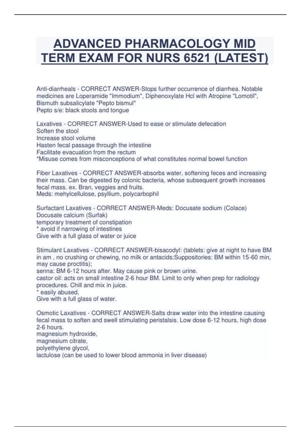 ADVANCED PHARMACOLOGY MID TERM EXAM FOR NURS 6521 (LATEST) Anti-diarrheals - CORRECT ANSWER-Stops further occurrence of diarrhea. Notable medicines are Loperamide "Immodium", Diphenoxylate Hcl with Atropine "Lomotil", Bismuth subsalicylate "Pepto bismul" Pepto s/e: black stools and tongue Laxatives - CORRECT ANSWER-Used to ease or stimulate defecation Soften the stool Increase stool volume Hasten fecal passage through the intestine Facilitate evacuation from the rectum *Misuse comes from misconceptions of what constitutes normal bowel function Fiber Laxatives - CORRECT ANSWER-absorbs water, softening feces and increasing their mass. Can be digested by colonic bacteria, whose subsequent growth increases fecal mass. ex. Bran, veggies and fruits. Meds: mehylcellulose, psyllium, polycarbophil Surfactant Laxatives - CORRECT ANSWER-Meds: Docusate sodium (Colace) Docusate calcium (Surfak) temporary treatment of constipation * avoid if narrowing of intestines Give with a full glass of water or juice Stimulant Laxatives - CORRECT ANSWER-bisacodyl: (tablets: give at night to have BM in am , no crushing or chewing, no milk or antacids;Suppositories: BM within 15-60 min, may cause proctitis); senna: BM 6-12 hours after. May cause pink or brown urine. castor oil: acts on small intestine 2-6 hour BM. Limit to only when prep for radiology procedures. Chill and mix in juice. * easily abused, Give with a full glass of water. Osmotic Laxatives - CORRECT ANSWER-Salts draw water into the intestine causing fecal mass to soften and swell stimulating peristalsis. Low dose 6-12 hours, high dose 2-6 hours. magnesium hydroxide, magnesium citrate, polyethylene glycol, lactulose (can be used to lower blood ammonia in liver disease) * Increase fluid intake. Not good for kidney disease. Sodium phosphate exacerbates cardiac disease. Miscellaneous Laxatives - CORRECT ANSWER-Lubiprostone, mineral oil, glycerin suppository, polyethylene glycol- electrolyte solution, Sodium picosulfate / magnesium oxide/anhydrous citric acid antiemetic - CORRECT ANSWER-a medication that is administered to prevent or relieve nausea and vomiting Ondesetron Class: 5HT3 receptor antagonist - CORRECT ANSWER-Zofran Indication: Chemotherapy N/V, postoperative N/V, radiation induced N/V Oral or Parental * Prolonges QT interval (leading to torsades de pointes) Glucocorticoids used as antiemetic - CORRECT ANSWER-Not approved by FDA. Solumedrol and dexamethasone. Given IV. Metoclopramide (Reglan) - CORRECT ANSWER-controls post-op NV suppresses emesis and increases upper GI mobility Cannabinoids - CORRECT ANSWER-Dronabinol (marinol) and Nabilone (cesamet). Suppresses CINV. Alosetron (Lotronex) - CORRECT ANSWER-Used for IBS-D in women that has lasted 6 months Blocks 5-HT3 receptors resulting in firm stool and decrease in urgency and frequency of defecation Can cause constipation PPIs - CORRECT ANSWER-Proton-pump inhibitors - pronounced and long-lasting reduction of gastric acid production - destroyed by stomach acid (take on empty stomach) - work really well - "attack from the back" - used as a controller Ex. Omeprazole (Prilosec) Mesalamine - CORRECT ANSWER-treats ulcerative colitis Ranitidine (Zantac) - CORRECT ANSWER-H2 receptor antagonist. Potent inhiitor of gastric acid secretion Indications: GERD, ulcers, H. pylori, reflux, indigestion ADR: Pain, constipation, diarrhea, headache. Can cause jaundice Ulcers treatment - CORRECT ANSWER-likely caused by H. pylori. Treat with antibiotic and pepto bismol, proton pump inhibitors (prilosec, prevacid, aciphex, nexium, protonix), H-2 blockers (zantac, pepcid, tagamet, nazatidine), antacids, and cytoprotective agens (carafate, cytotec) irritable bowel syndrome (IBS) - CORRECT ANSWER-periodic disturbances of bowel function, such as diarrhea and/or constipation, usually associated with abdominal pain. Intermittent diarrhea and constipation with pain.