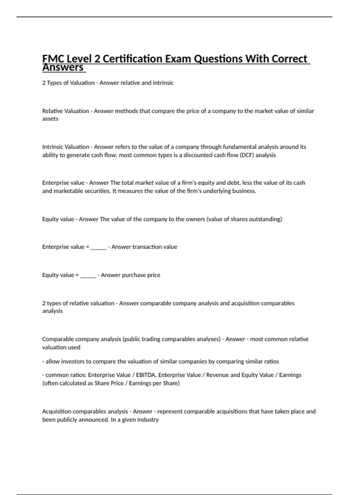 2 Types of Valuation - Answer relative and intrinsic Relative Valuation - Answer methods that compare the price of a company to the market value of similar assets Intrinsic Valuation - Answer refers to the value of a company through fundamental analysis around its ability to generate cash flow; most common types is a discounted cash flow (DCF) analysis Enterprise value - Answer The total market value of a firm's equity and debt, less the value of its cash and marketable securities. It measures the value of the firm's underlying business. Equity value - Answer The value of the company to the owners (value of shares outstanding) Enterprise value = _____ - Answer transaction value Equity value = _____ - Answer purchase price 2 types of relative valuation - Answer comparable company analysis and acquisition comparables analysis Comparable company analysis (public trading comparables analyses) - Answer - most common relative valuation used - allow investors to compare the valuation of similar companies by comparing similar ratios - common ratios: Enterprise Value / EBITDA, Enterprise Value / Revenue and Equity Value / Earnings (often calculated as Share Price / Earnings per Share) Acquisition comparables analysis - Answer - represent comparable acquisitions that have taken place and been publicly announced. In a given industry - typically larger multiples than multiples for comparable companies, because acquirers typically need to pay a premium to the current share price to gain control of the company Discounted cash flow (DCF) analysis - Answer discounts all projected future cash flow of a company to the present by using the concept of the time value of money DCF cash flow projections - Answer USES: - unlevered free cash flow (add adjustments for depreciation and amortization, change in working capital and capital expenditures to tax-effected EBIT) - Tax-effected EBIT instead of net income b/c the valuation of a company should not be dependent on capital structure. Interest expense is subtracted from EBIT to arrive at net income on the income statement, applying a corporate tax rate directly to EBIT without subtracting interest expense eliminates the impact of capital structure to cash flow - cash flow projected out into the projection period (normally 5 years) - high growth business or start-up could use 10 year period - end the model with a financial year representative of a "steady state" to ensure the analysis does not over- or understate total valuation Unlevered free cash flow - Answer represents the cash flow available to all stakeholders in the business (i.e. it is not affected by capital structure and, accordingly, does not include interest expense) Present value of the projection period - Answer to determine the present value of a company FIRST calculate the present value of each year's unlevered free cash flow (discount each year's cash flow to the present value using a discount rate) Discount rate - Answer - reflects the cost of capital from the perspective of the stakeholder who is analyzing a company - for a DCF analysis it is the cost of capital for the business valued - Weighted average cost of capital (WACC) is used to find the discount rate or a range of rates - companies may add a premium to the WACC to determine a "hurdle rate" and be used as the discount rate