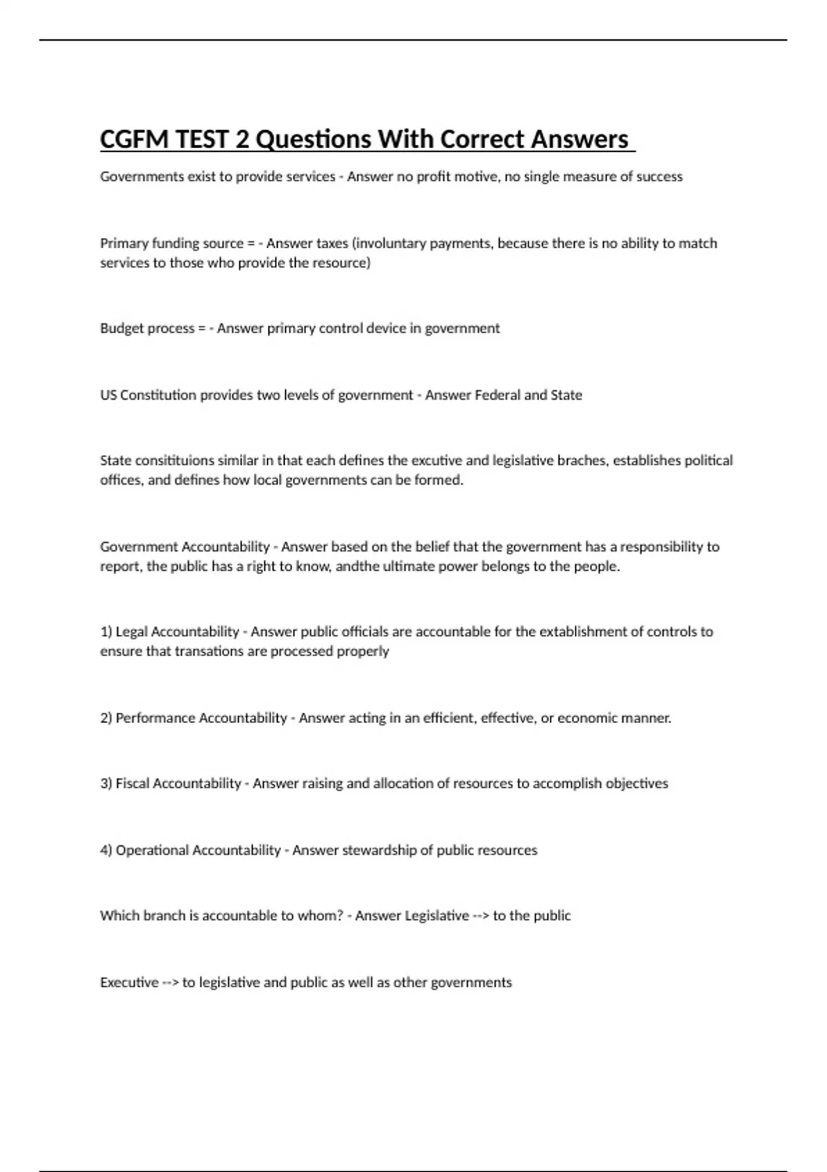 Governments exist to provide services - Answer no profit motive, no single measure of success Primary funding source = - Answer taxes (involuntary payments, because there is no ability to match services to those who provide the resource) Budget process = - Answer primary control device in government US Constitution provides two levels of government - Answer Federal and State State consitituions similar in that each defines the excutive and legislative braches, establishes political offices, and defines how local governments can be formed. Government Accountability - Answer based on the belief that the government has a responsibility to report, the public has a right to know, andthe ultimate power belongs to the people. 1) Legal Accountability - Answer public officials are accountable for the extablishment of controls to ensure that transations are processed properly 2) Performance Accountability - Answer acting in an efficient, effective, or economic manner. 3) Fiscal Accountability - Answer raising and allocation of resources to accomplish objectives 4) Operational Accountability - Answer stewardship of public resources Which branch is accountable to whom? - Answer Legislative -- to the public Executive -- to legislative and public as well as other governments Interperiod Equity - Answer current generation of citizens should not be able to shift the burden of paying for current-year services to future taxpayers balanced budget law = current year services must be financed with current year revenues (problem is financial data can be manipulated to achieve this). Fed Gov't not subject to this. Laws prohibiting borrowing - Answer * only to meet cash flow needs * not for operating purposes * should match the useful life of capital assets Users of financial reports - Answer 1) Legislators and oversight groups 2) Citizens and taxpayers 3) Investors and Creditors 4) Media 5) Financial and Program managers 6) Employees and employee organizations Need for financial reports - Answer 1) primary communication device for assessing accountability 2) aid in decision making process (economic, social, and political) * planning and administration * results of operations * financial condition of the organization Point in time financial reports - Answer provides current information as of the date of the reports (e.g. balance sheet) Period financial reports - Answer reports the activity for an entire fiscal period (month, year) General Purpose External Financial Reports (GPEFR)/CAFR - Answer 1) audited financial statements (including notes) "basic financial statements" - state/local "principal financial statements" - federal 2) required supplementary information 3) other accompanying information (voluntary) Special Purpose Financial Reports (may or may not be provided to external users) - Answer * budget comparison reports * cash position reports * offering statements (when issuing debt) * popular reports *grantor reports * service efforts and accomplishments * economy and efficiency Reporting Characteristics - Answer 1) understandability 2) reliability - info is verfiable and free from bias 3) relevance 4) timeliness - for decision making purposes 5) consistency - any change in method or principle should be noted 6) comparability ** most comprehensive financial reports provide non-financial information regarding the performance of the entity. ** info is often based on judgements or estimates base on the application of rules or conventions American Recovery and Reinvestment Act (2009) - Answer ** important because it required online reporting of the use of government funds awarded for the purpose of stimulating the economy - R Federal Open Government Initiative - Answer government should be transparent, participatory, and collaborative * State Dept, Justice Dept, HHS, NASA, Treasury Dept, EPA, Defense, and SSA Digital Accountability and Transparency Act (DATA Act - 2014) - Answer 1) expanded FFATA of 2006 2) established government wide data standards that is displayed on USA 3) simplified reporting for federal funding recipients 4) agencies held accountable for the accuracy and completeness of data submitted to USA 5) apply approaches developed by the Recovery Accountability and Transparency Board open government challenges - Answer making information accessible while securing personally identifiable information Securities and Exchange Commission (SEC) 1934 - Answer vested with the power to regulate securities markets, requires publicly traded companies to disclose certain financial information SEC gave authority to set accounting standards to the Financial Accounting Foundation (FAF), who appoints members to the FASB to set reporting and accounting standards for private and non-profits National Committee of Municipal Accounting (1934) - Answer * set first reporting standards for states and locals, and established the Municipal Finance Officers Association (MFOA), which was active until 1941 National Council of Government Accounting (NCGA - 1948) .... later became GFOA - Answer issued the Governmental Accounting, Auditing, and Financial Reporting (GAAFR/Blue Book) in 1968, however local policy retained primacy Audits of State and Local Government Units (ASLGU) - Answer issued in 1974 by AICPA in response to several government financial melt-downs * recognized the principles in the GAAFR and made them the accepted principles for all state and locals within the auditing committee, but there was no requirement for compliance (due to their sovereign status) Governmental Accounting Standards Board (GASB, 1984) - Answer established in lieu of expanding FASBs authority GASB standards still not required, but may be necessary for bonding and borrowing, plus good public policy, so many enacted legislation requiring compliance Federal Accounting Standards Advisory Board (FASAB, 1990) - Answer established by the OMB, Sec of Treasury, and Comptroller general to address additional financial reporting standards (most were 