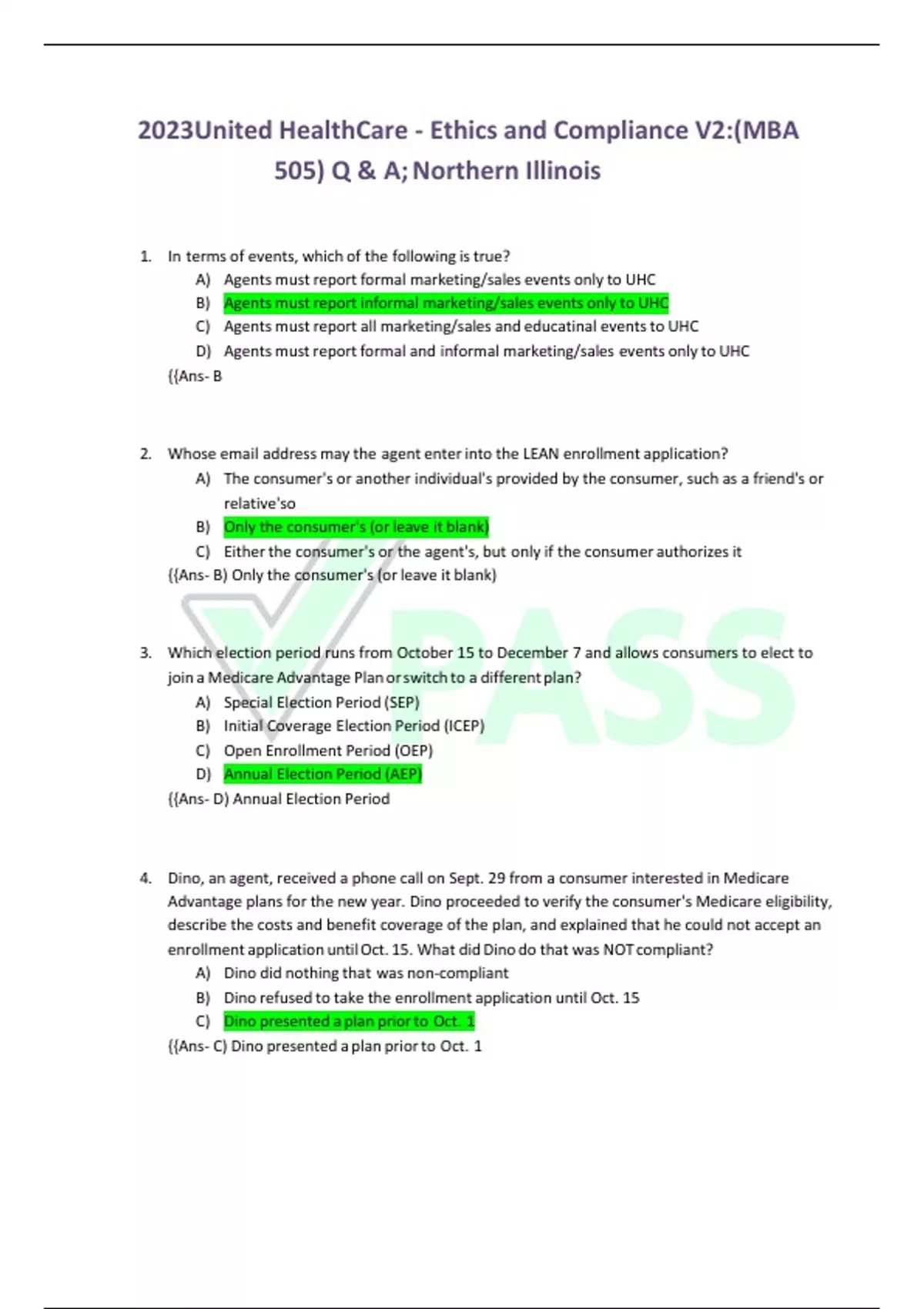 2023United HealthCare - Ethics and Compliance V2:(MBA 505) Q & A;Northern Illinois 1. In terms of events, which of the following is true? A) Agents must report formal marketing/sales events only to UHC B) Agents must report informal marketing/sales events only to UHC C) Agents must report all marketing/sales and educatinal eventsto UHC D) Agents must report formal and informal marketing/sales events only to UHC {{Ans- B 2. Whose email address may the agent enter into the LEAN enrollment application? A) The consumer's or another individual's provided by the consumer, such as a friend's or relative'so B) Only the consumer's (orleave it blank) C) Eitherthe consumer's or the agent's, but only if the consumer authorizes it {{Ans- B) Only the consumer's (orleave it blank) 3. Which election period runs from October 15 to December 7 and allows consumers to elect to join a Medicare Advantage Plan orswitch to a differentplan? A) Special Election Period (SEP) B) Initial Coverage Election Period (ICEP) C) Open Enrollment Period (OEP) D) Annual Election Period (AEP) {{Ans- D) Annual Election Period 4. Dino, an agent, received a phone call on Sept. 29 from a consumer interested in Medicare Advantage plans for the new year. Dino proceeded to verify the consumer's Medicare eligibility, describe the costs and benefit coverage of the plan, and explained that he could not accept an enrollment application untilOct. 15. What didDino do that was NOT compliant? A) Dino did nothing that was non-compliant B) Dino refused to take the enrollment application until Oct. 15 C) Dino presented a plan priorto Oct. 1 {{Ans- C) Dino presented a plan priorto Oct. 1 5. You have scheduled an appointment and obtained a Scope of Appointment ( SOA) form to discuss Medicare Advantage Plans with a consumer. When you arrive at the appointment, a friend of the consumer who is Medicare-eligible is present to hear your presentation. What should you do? A) Before you can start the appointment with both consumers, ask the consumer'sfriend to complete an SOA B) Ask the consumer's friend to complete the SOA and schedule a separate appointment C) Tell the consumerthat you will come back on another day D) Ask the consumer's friend to leave since she had not scheduled the appointment. {{Ans- A) Before you can start the appointment with both consumers, ask the consumer's friend to complete an SOA 6. Providing objective information about the Medicare program and/or health improvement and wellness at public venuesisthe purpose of which of the following? A) Formal marketing/sales events. B) Educational events C) Personal/individual marketing appointments D) Informal marketing/sales events {{Ans- B) Educational events 7. Janine, currently enrolled in a 3-star plan, discovers there is a 5-star plan available where she lives. She asks her agent, Josh, to enroll her in the 5-star plan. Josh can advise Janine of each of the following except: A) Josh should tell Janine that she can change her current plan to a 5-star plan since one is available in the areawhere she lives. B)Josh should tell Janine thatshe can only use the 5-star SEP once per calendar year C) Josh should tell Janine that the new coverage will start the first month after she enrolls in the 5 star plan D) Josh should tell Janine thatshe can only change her current plan to a 5 star plan during the Annual Election Period {{Ans- D) Josh should tell Janine that she can only change her current plan to a 5 star plan during the AEP 8. Agent Bryan wants to grow his book of business. Which of the following lead generating activitiesisNOTcompliant? A) At each appointment he asks the consumer for the name and phone number of at least one acquaintance who is 65 or older B) At each appointment he provides extra business cards to the consumer and asks that they passthemalong to acquaintances C) After enrolling a consumer, he mails a thank you card from the UHC Toolkit and encloses a few business cardsforthe new memberto pass along to acquaintances. {{Ans- A) At each appointment he asks the consumer for the name and phone number of at least one acquaintance who is 65 or older 9. Agent Ralph wants to market Advantage Plans in his neighborhood - an area that consists of single-family houses, an assisted living facility, a church, and public library. Which of the followingmethods of contactis permitted? A) Ralph sends a flyer inviting consumers to a marketing/sales event to each resident via postal mail B) Ralph puts a flyer inviting consumers to a marketing/sales event on the door of each house. C) Ralph stands in the lobby of the assisted living facility and hands out to the residents a flyerinviting themto a marketing/sales event. D) Ralph puts a flyer inviting consumers to a marketing/sales event on the windshield of each car in the church parking lot on Sunday morning. {{Ans- A 10. John has Power of Attorney to act on behalf of his mother. What does that mean when it comes to hismotherenrolling in aMedicare Advantage Plan? A) John may sign the Enrollment Application and must be able to provide documentation upon request by the plan that indicates his authority under state law to enroll his mother B) John may sign the Enrollment Application, but does not need to provide documentation to support his claimof authority upon request by the plan C) John may sign the Enrollment Application and must submit documentation that indicates his authority understate law to enroll his mother with the application D) John may attend a idual marketing appointment with his mother, but has no authority to sign the Enrollment Application {{Ans- A) John may sign the Enrollment Application and must be able to provide documentation upon request by the plan that indicates his authority understate law to enroll hi mother 11. When can telephonic contact with a Medicare eligible consumer be made? A) When the consumer consented to be contacted for sales activities, subsequent telephonic contact has not yet occurred, and the perm