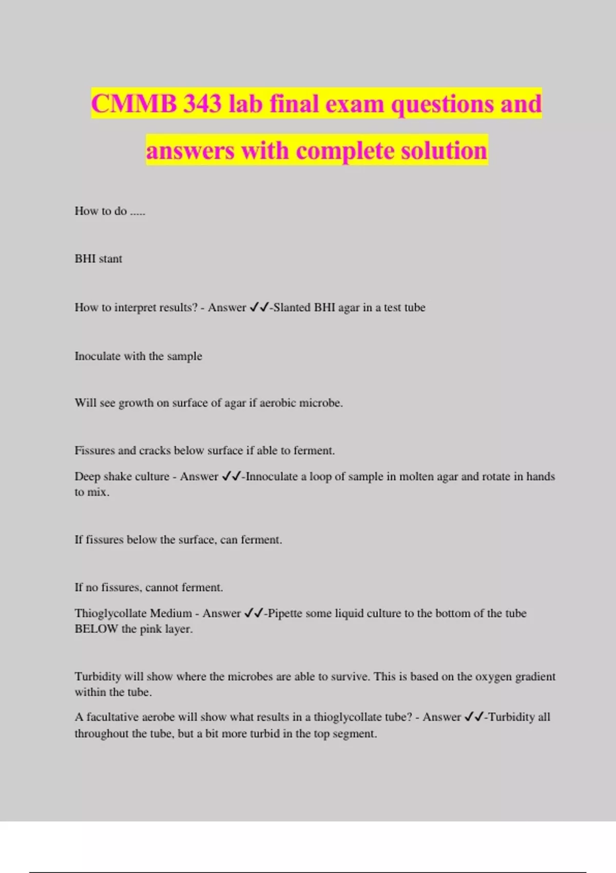 CMMB 343 lab final exam questions and answers with complete solution How to do ..... BHI stant How to interpret results? - Answer ️️ -Slanted BHI agar in a test tube Inoculate with the sample Will see growth on surface of agar if aerobic microbe. Fissures and cracks below surface if able to ferment. Deep shake culture - Answer ️️ -Innoculate a loop of sample in molten agar and rotate in hands to mix. If fissures below the surface, can ferment. If no fissures, cannot ferment. Thioglycollate Medium - Answer ️️ -Pipette some liquid culture to the bottom of the tube BELOW the pink layer. Turbidity will show where the microbes are able to survive. This is based on the oxygen gradient within the tube. A facultative aerobe will show what results in a thioglycollate tube? - Answer ️️ -Turbidity all throughout the tube, but a bit more turbid in the top segment. What is the upper pink layer of a thioglycollate tube? - Answer ️️ -oxygenated layer When they say "oxygen is a nutrient" what is meant? - Answer ️️ -It is needed as the final e- acceptor in the ETC to generate ATP. Name 2 enzymes that are part of respiration. What 2 tests can be used to detect them? - Answer ️️ -cytochrome c oxidase Oxidase test catalase Catalase test How to do and interpret.... oxidase test - Answer ️️ --hold the RED end of oxidase stick -put BROWN end into cells Negative result: colourless Positive result: blue How to do and interpret.... catalase test - Answer ️️ -Add 2 drops of hydrogen peroxide to a colony on an agar plate if bubbling, catalase is present What are the gas bubbles you see in a positive catalase test? - Answer ️️ -O2 The enzyme catalase converts the added Hydrogen Peroxide to ___________ and ___________. - Answer ️️ -water and oxygen gas How to do and interpret.... H&L glucose test - Answer ️️ -use 2 H&L glucose test tubes. These have glucose as a carbon source in the medium. Shows if and where the species can use glucose as a c