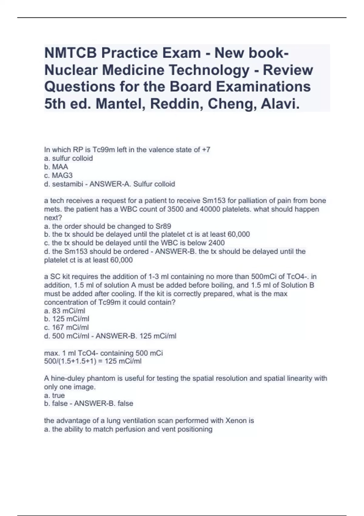 NMTCB Practice Exam - New book-Nuclear Medicine Technology - Review Questions for the Board Examinations 5th ed. Mantel, Reddin, Cheng, Alavi.