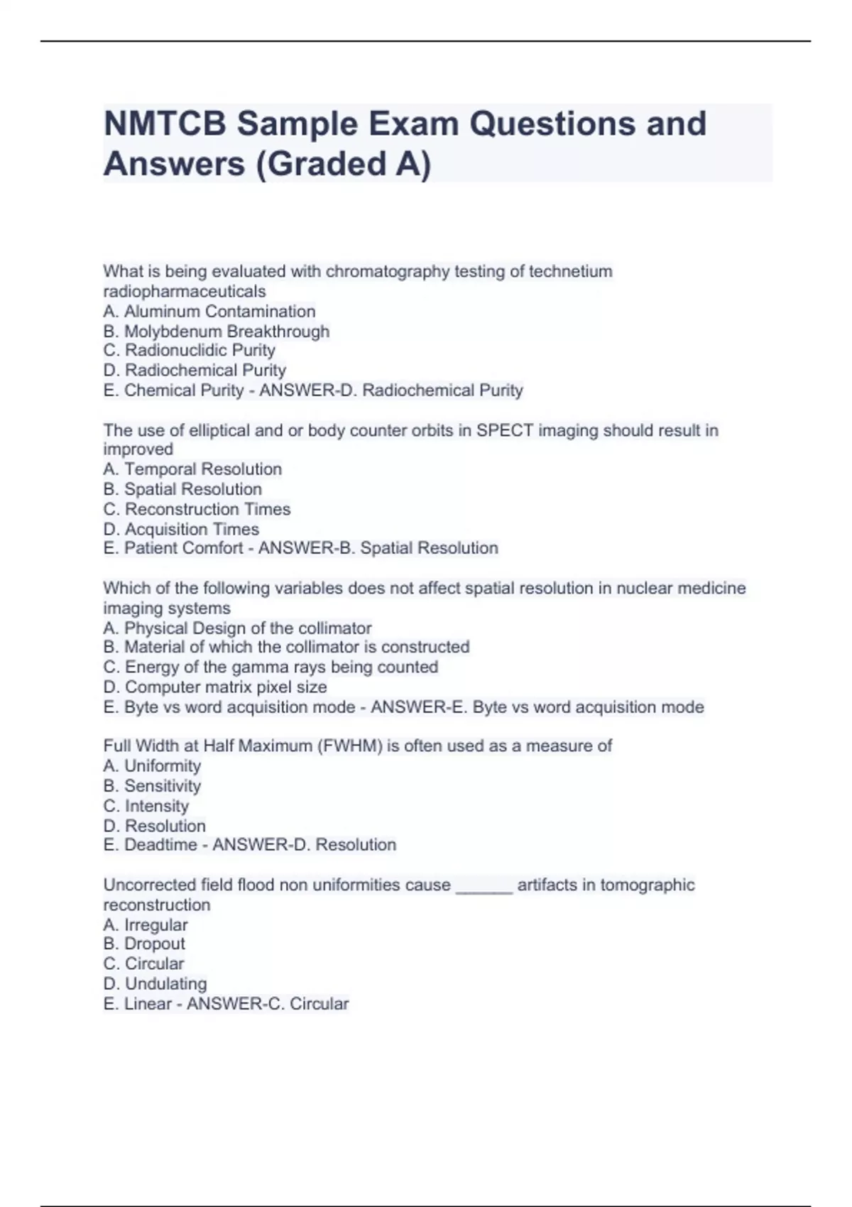 What is being evaluated with chromatography testing of technetium radiopharmaceuticals A. Aluminum Contamination B. Molybdenum Breakthrough C. Radionuclidic Purity D. Radiochemical Purity E. Chemical Purity - ANSWER-D. Radiochemical Purity The use of elliptical and or body counter orbits in SPECT imaging should result in improved A. Temporal Resolution B. Spatial Resolution C. Reconstruction Times D. Acquisition Times E. Patient Comfort - ANSWER-B. Spatial Resolution Which of the following variables does not affect spatial resolution in nuclear medicine imaging systems A. Physical Design of the collimator B. Material of which the collimator is constructed C. Energy of the gamma rays being counted D. Computer matrix pixel size E. Byte vs word acquisition mode - ANSWER-E. Byte vs word acquisition mode Full Width at Half Maximum (FWHM) is often used as a measure of A. Uniformity B. Sensitivity C. Intensity D. Resolution E. Deadtime - ANSWER-D. Resolution Uncorrected field flood non uniformities cause ______ artifacts in tomographic reconstruction A. Irregular B. Dropout C. Circular D. Undulating E. Linear - ANSWER-C. Circular