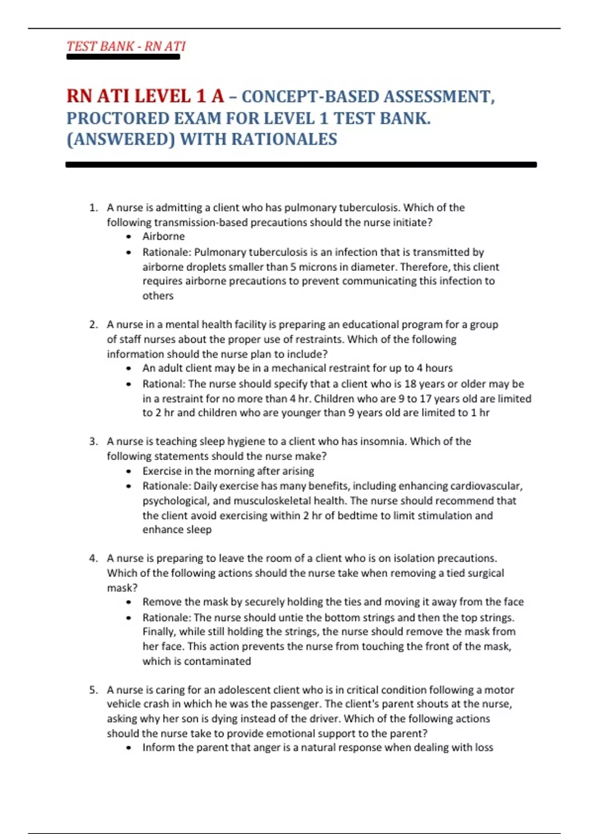 RN ATI LEVEL 1 A – CONCEPT-BASED ASSESSMENT, PROCTORED EXAM FOR LEVEL 1 TEST BANKA nurse is admitting a client who has pulmonary tuberculosis. Which of the following transmission-based precautions should the nurse initiate? • Airborne • Rationale: Pulmonary tuberculosis is an infection that is transmitted by airborne dropletssmaller than 5 micronsin diameter. Therefore, this client requires airborne precautions to prevent communicating this infection to others 2. A nurse in a mental health facility is preparing an educational program for a group of staff nurses about the proper use of restraints. Which of the following information should the nurse plan to include? • An adult client may be in a mechanical restraint for up to 4 hours • Rational: The nurse should specify that a client who is 18 years or older may be in a restraint for no more than 4 hr. Children who are 9 to 17 years old are limited to 2 hr and children who are younger than 9 years old are limited to 1 hr 3. A nurse is teaching sleep hygiene to a client who has insomnia. Which of the following statements should the nurse make? • Exercise in the morning after arising • Rationale: Daily exercise has many benefits, including enhancing cardiovascular, psychological, and musculoskeletal health. The nurse should recommend that the client avoid exercising within 2 hr of bedtime to limit stimulation and enhance sleep 4. A nurse is preparing to leave the room of a client who is on isolation precautions. Which of the following actions should the nurse take when removing a tied surgical mask