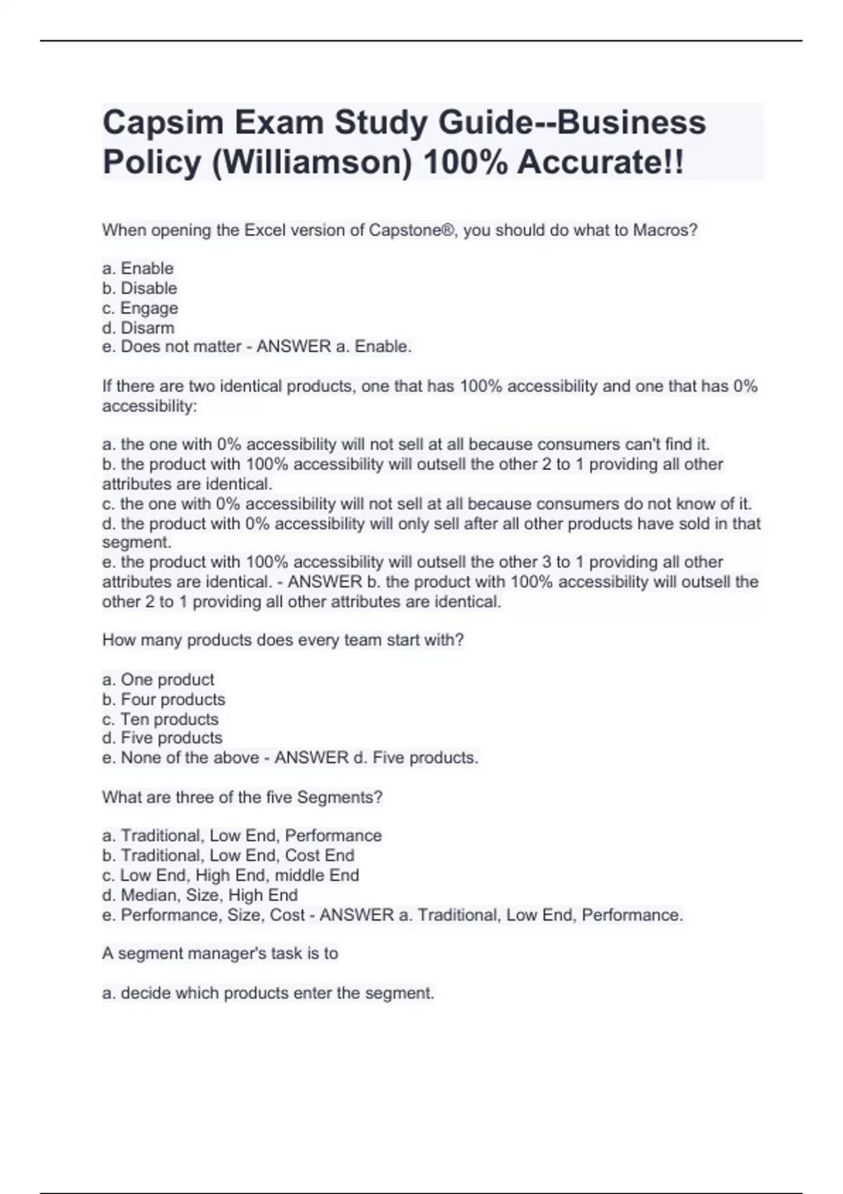 When opening the Excel version of Capstone®, you should do what to Macros? a. Enable b. Disable c. Engage d. Disarm e. Does not matter - ANSWER a. Enable. If there are two identical products, one that has 100% accessibility and one that has 0% accessibility: a. the one with 0% accessibility will not sell at all because consumers can't find it. b. the product with 100% accessibility will outsell the other 2 to 1 providing all other attributes are identical. c. the one with 0% accessibility will not sell at all because consumers do not know of it. d. the product with 0% accessibility will only sell after all other products have sold in that segment. e. the product with 100% accessibility will outsell the other 3 to 1 providing all other attributes are identical. - ANSWER b. the product with 100% accessibility will outsell the other 2 to 1 providing all other attributes are identical. How many products does every team start with? a. One product b. Four products c. Ten products d. Five products e. None of the above - ANSWER d. Five products. What are three of the five Segments? a. Traditional, Low End, Performance b. Traditional, Low End, Cost End c. Low End, High End, middle End d. Median, Size, High End e. Performance, Size, Cost - ANSWER a. Traditional, Low End, Performance. A segment manager's task is to a. decide which products enter the segment. b. verify the products entering and leaving a segment, the margin potential for those products, capacity level and the distribution system as compared to competitors. c. review margin potential for each segment and evaluate the capacity for each segment compared to the competition. d. evaluate the capacity for each segment based on total demand and the competitor's capacity; evaluate the margin potential of all products and the distribution systems. e. none of the above. - ANSWER b. verify the products entering and leaving a segment, the margin potential for those products, capacity level and the distribution system as compared to competitors. What is the difference between the market segments at the beginning of the round to the final round? a. They all drift at an average rate of .7; down and to the right. b. The fine cuts overlap in the beginning and in year 8 only the rough cuts overlap. c. The fine and rough cuts overlap in the beginning and by round 8 neither the fine nor rough cuts overlap. d. The traditional and low segment rough cuts overlap but all the remaining segments do not.
