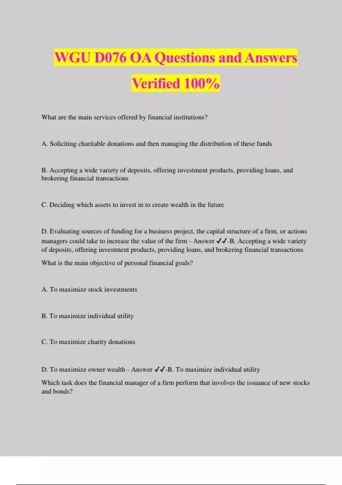 WGU D076 OA Questions and Answers Verified 100% What are the main services offered by financial institutions? A. Soliciting charitable donations and then managing the distribution of these funds B. Accepting a wide variety of deposits, offering investment products, providing loans, and brokering financial transactions C. Deciding which assets to invest in to create wealth in the future D. Evaluating sources of funding for a business project, the capital structure of a firm, or actions managers could take to increase the value of the firm - Answer ️️ -B. Accepting a wide variety of deposits, offering investment products, providing loans, and brokering financial transactions What is the main objective of personal financial goals? A. To maximize stock investments B. To maximize individual utility C. To maximize charity donations D. To maximize owner wealth - Answer ️️ -B. To maximize individual utility Which task does the financial manager of a firm perform that involves the issuance of new stocks and bonds? A. Making financing decisions B. Managing working capital C. Deciding on accounting standards D. Making investing decisions - Answer ️️ -A. Making financing decisions Why is understanding the definition of finance important in managing personal finances? A. It helps individuals compare the costs and benefits of an action to determine whether to take that action. B. It helps individuals act ethically with regard to finances. C.It helps individuals understand legal issues related to finance. D. It allows individuals to find an investment with the highest return possible. - Answer ️️ -A. It helps individuals compare the costs and benefits of an action to determine whether to take that action. In which type of market would a company issue bonds or stocks for the first time? Dealer market Primary market Secondary market Money market - Answer ️️ -Primary market Which type of financial institution is a mutual fund?
