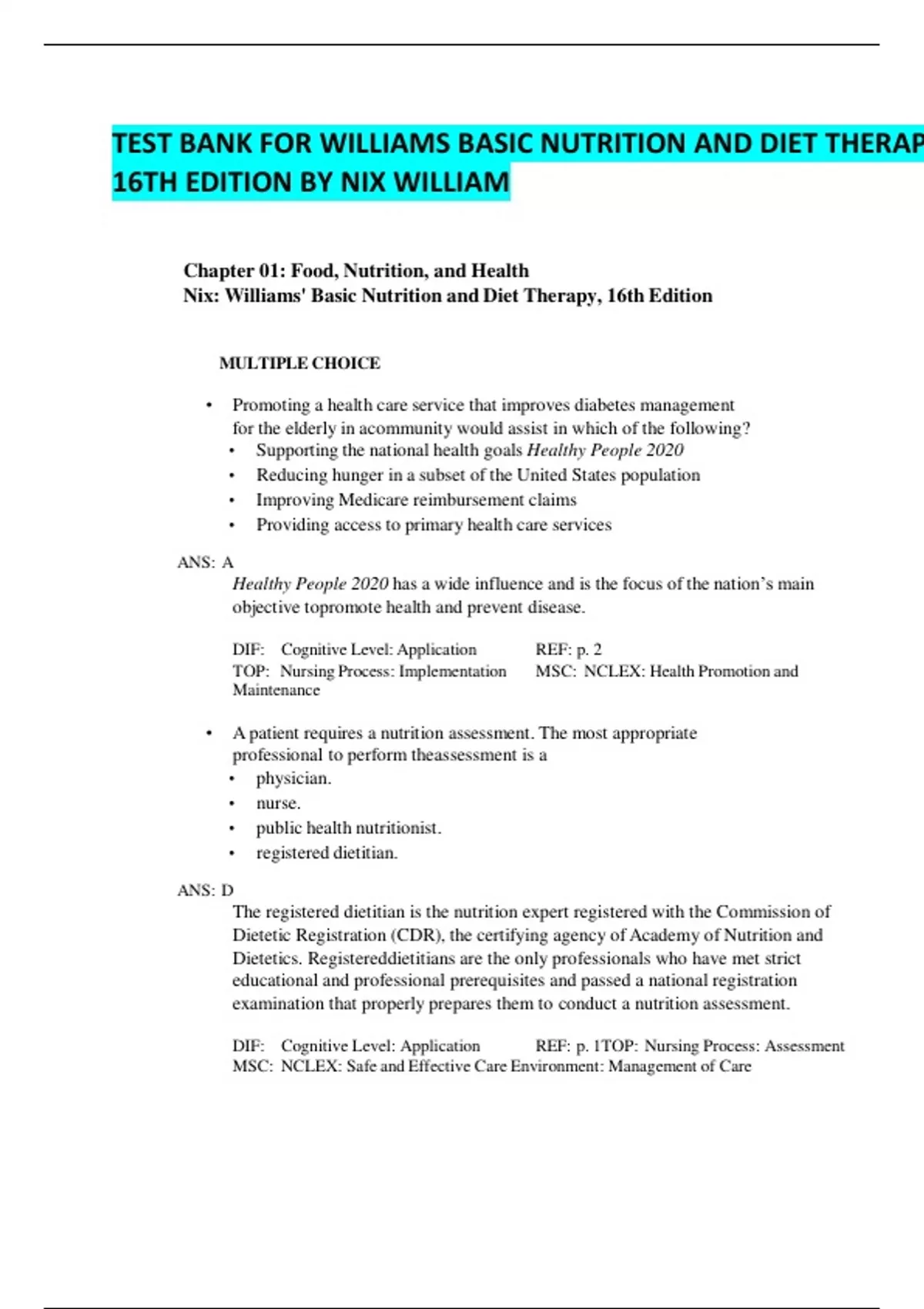 TEST BANK FOR WILLIAMS BASIC NUTRITION AND DIET THERAPY 16TH EDITION BY NIX WILLIAM