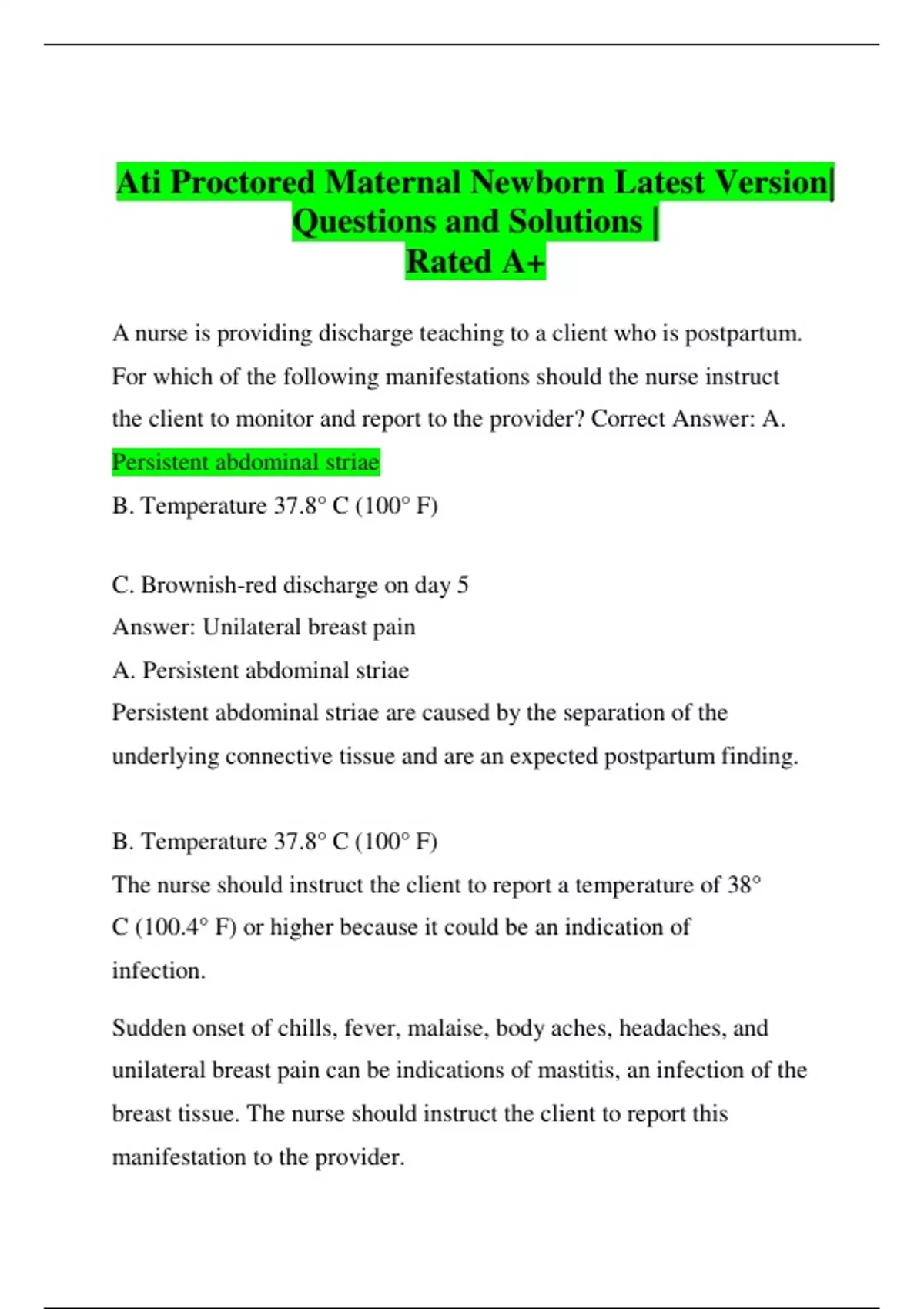 Ati Proctored Maternal Newborn Latest Version| Questions and Solutions | Rated A+