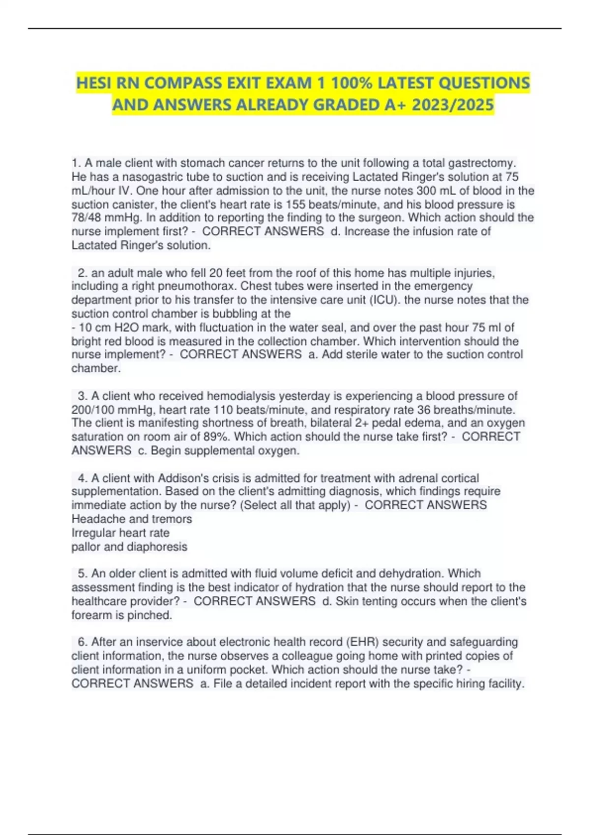 HESI RN COMPASS EXIT EXAM 1 100% LATEST QUESTIONS AND ANSWERS ALREADY GRADED A+ 2023/2025 1. A male client with stomach cancer returns to the unit following a total gastrectomy. He has a nasogastric tube to suction and is receiving Lactated Ringer's solution at 75 mL/hour IV. One hour after admission to the unit, the nurse notes 300 mL of blood in the suction canister, the client's heart rate is 155 beats/minute, and his blood pressure is 78/48 mmHg. In addition to reporting the finding to the surgeon. Which action should the nurse implement first? - CORRECT ANSWERS d. Increase the infusion rate of Lactated Ringer's solution. 2. an adult male who fell 20 feet from the roof of this home has multiple injuries, including a right pneumothorax. Chest tubes were inserted in the emergency department prior to his transfer to the intensive care unit (ICU). the nurse notes that the suction control chamber is bubbling at the - 10 cm H2O mark, with fluctuation in the water seal, and over the past hour 75 ml of bright red blood is measured in the collection chamber. Which intervention should the nurse implement? - CORRECT ANSWERS a. Add sterile water to the suction control chamber. 3. A client who received hemodialysis yesterday is experiencing a blood pressure of 200/100 mmHg, heart rate 110 beats/minute, and respiratory rate 36 breaths/minute. The client is manifesting shortness of breath, bilateral 2+ pedal edema, and an oxygen saturation on room air of 89%. Which action should the nurse take first? - CORRECT ANSWERS c. Begin supplemental oxygen. 4. A client with Addison's crisis is admitted for treatment with adrenal cortical supplementation. Based on the client's admitting diagnosis, which findings require immediate action by the nurse? (Select all that apply) - CORRECT ANSWERS Headache and tremors Irregular heart rate pallor and diaphoresis 5. An older client is admitted with fluid volume deficit and dehydration. Which assessment finding is the best indicator of hydration that the nurse should report to the healthcare provider? - CORRECT ANSWERS d. Skin tenting occurs when the client's forearm is pinched. 6. After an inservice about electronic health record (EHR) security and safeguarding client information, the nurse observes a colleague going home with printed copies of client information in a uniform pocket. Which action should the nurse take? - CORRECT ANSWERS a. File a detailed incident report with the specific hiring facility. 7. The nurse is evaluating a tertiary prevention program for clients with cardiovascular disease implemented in a rural health clinic. Which outcome indicate the program is effective? - CORRECT ANSWERS c. Clients who incurred disease complications promptly received rehabilitation. 8. The nurse is caring for a client with chronic obstructive pulmonary disease (COPD) who uses oxygen at 2 L/minute per nasal cannula continuously. The nurse observes that the client is having increased shortness of breath with respirations at 23 breaths/minute. Which action should the nurse implement first? - CORRECT ANSWERS d. Assess the delivery mechanism of the oxygen tank, tubing, and cannula. 9. Which statement by a client who is 24 hours post-subtotal thyroidectomy requires an immediate investigation by the nurse? - CORRECT ANSWERS When I get out of bed quickly, I feel a little dizzy." 10. An older adult male who is in his early 70's is admitted to the emergency department because of a COPD exacerbation. This client is struggling to breathe and the healthcare team is preparing for endotracheal intubation. The spouse's wife, who is 30 years younger than the client, asks the nurse to stop the procedure and provide the nurse a copy of the client's living will. Which action should the nurse take? - CORRECT ANSWERS b. Notify the healthcare provider of the client's wishes. 11. An unlicensed assistive personnel (UAP) is assigned to provide personal care for a client whose prescribed activity is bedrest with bedside commode use. The UAP reports to the nurse that the client is so obese that the UAP feels unable to safely assist the client in transferring from the bed to the bedside commode. How should the nurse respond? - CORRECT ANSWERS c. Advice the client to maintain bedrest so that safety can be ensured. 12. A nurse determines that more than 25% of the students at a middle school are overweight. The nurse presents the information at the parent-teacher meeting. What action is most important for the nurse to include in the meeting? - CORRECT ANSWERS c. Distribute a shopping list of suggested healthy snack items. 13. After several months of chronic fatigue, morning stiffness, and join pain, a young adult is diagnosed with rheumatoid arthritis, and the healthcare provider prescribes prednisone. Which education should the nurse provide the client with regard to taking prednisone? - CORRECT ANSWERS c. If sequential doses are missed, notify the healthcare provider. 14. The psychiatric nurse is caring for clients on an adolescent unit. Which client requires the nurse's immediate attention? - CORRECT ANSWERS c. An 18-year-old client with antisocial behavior who is being yelled at by other clients 15. The nurse caring for a child with mononucleosis can expect the child to exhibit which symptoms? - CORRECT ANSWERS b. Ear pain and fever. 16. A client arrives for an annual physical exam and complains of having calf pain. The client's health history reveals peripheral atrial disease. Which question should the nurse ask the client about expected finding related to chronic arterial symptoms? - CORRECT ANSWERS b. Does the calf pain occur when walking short distances? 17. The nurse is preparing to send a client to the cardiac catheterization lab for an angioplasty. Which client report is most important for them to explore further prior to the start of the procedure? - CORRECT ANSWERS d. Experience facial swelling after eating crab. 18. The nurse is assessing a 4-year-old child with eczema. The child's ski