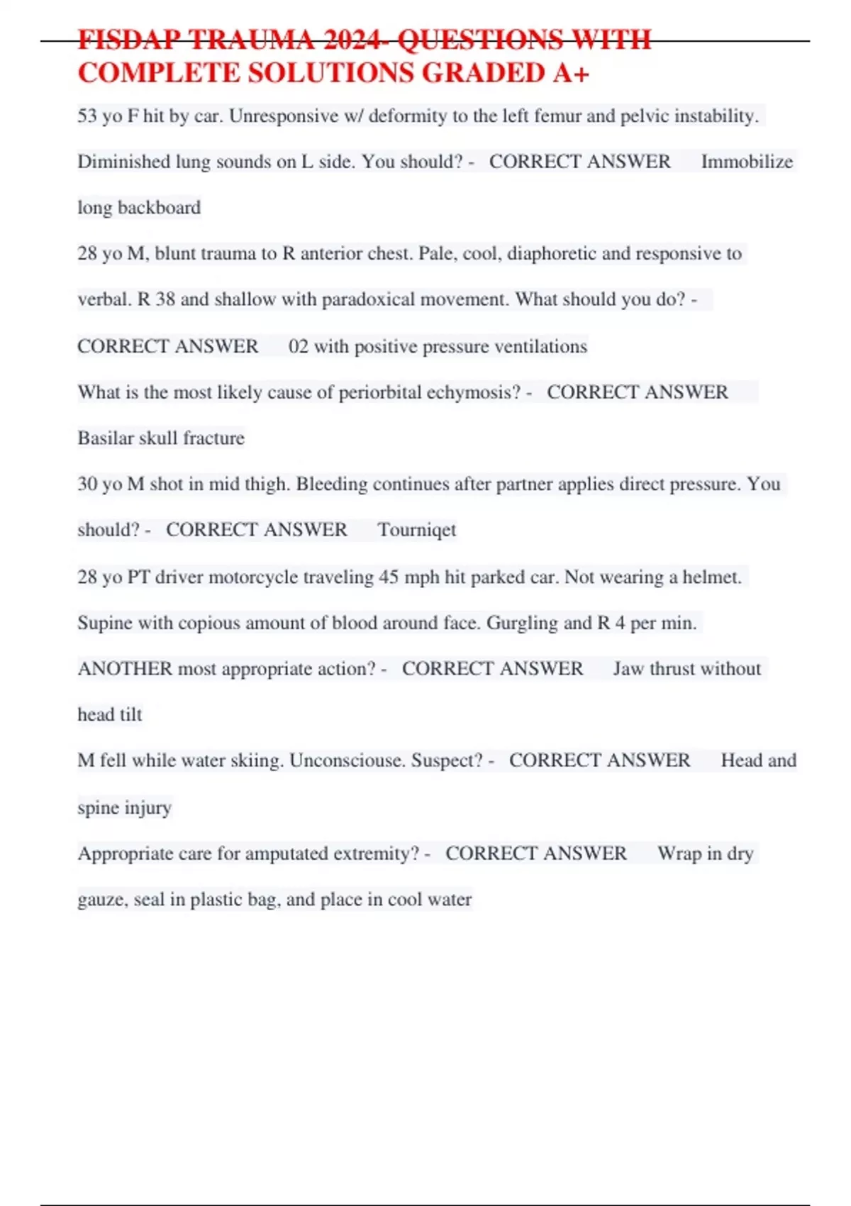 FISDAP TRAUMA 2024- QUESTIONS WITH COMPLETE SOLUTIONS GRADED A+ 53 yo F hit by car. Unresponsive w/ deformity to the left femur and pelvic instability. Diminished lung sounds on L side. You should? - CORRECT ANSWER Immobilize long backboard 28 yo M, blunt trauma to R anterior chest. Pale, cool, diaphoretic and responsive to verbal. R 38 and shallow with paradoxical movement. What should you do? - CORRECT ANSWER 02 with positive pressure ventilations What is the most likely cause of periorbital echymosis? - CORRECT ANSWER Basilar skull fracture 30 yo M shot in mid thigh. Bleeding continues after partner applies direct pressure. You should? - CORRECT ANSWER Tourniqet 28 yo PT driver motorcycle traveling 45 mph hit parked car. Not wearing a helmet. Supine with copious amount of blood around face. Gurgling and R 4 per min. ANOTHER most appropriate action? - CORRECT ANSWER Jaw thrust without head tilt M fell while water skiing. Unconsciouse. Suspect? - CORRECT ANSWER Head and spine injury Appropriate care for amputated extremity? - CORRECT ANSWER Wrap in dry gauze, seal in plastic bag, and place in cool water FISDAP TRAUMA 2024- QUESTIONS WITH COMPLETE SOLUTIONS GRADED A+ 28 yo pt driving motorcycle traveling 45 mph hit parked car. Not wearing a helmet. Supine with copious amount of blood around face. Gurgling and R 4 per min. Most appropriate? - CORRECT ANSWER Control bleeding 18 yo M holding right shin after sports related injury. Deformity and swelling; pedal pulse present. You should? - CORRECT ANSWER Apply board splint in position found Pedestrian hit by car. Pale, cool, and diaphoretic. Oriented to name only and has difficulty breathing. BP 80/40, P 120, R 28 and shallow. 90% SP02. You should? - CORRECT ANSWER BVM 81 yo F helthcare facility fell out of bed. Nurse suspects hip fracture. Which medication should concern you the most? - CORRECT ANSWER Coumadin You are treating a patient with agonal respirations and gunshot wound to the chest. You notice an open skull fracture leaking brain matter. There is no radial pulse, you should? - CORRECT ANSWER Asses a carotid pul