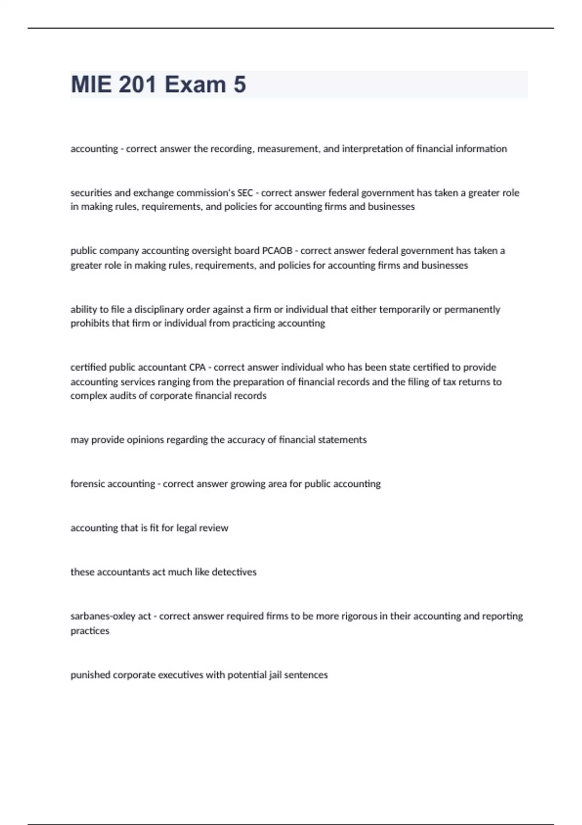MIE 201 Exam 5accounting - correct answer the recording, measurement, and interpretation of financial information securities and exchange commission's SEC - correct answer federal government has taken a greater role in making rules, requirements, and policies for accounting firms and businesses public company accounting oversight board PCAOB - correct answer federal government has taken a greater role in making rules, requirements, and policies for accounting firms and businesses ability to file a disciplinary order against a firm or individual that either temporarily or permanently prohibits that firm or individual from practicing accounting certified public accountant CPA - correct answer individual who has been state certified to provide accounting services ranging from the preparation of financial records and the filing of tax returns to complex audits of corporate financial records may provide opinions regarding the accuracy of financial statements forensic accounting - correct answer growing area for public accounting accounting that is fit for legal review these accountants act much like detectives sarbanes-oxley act - correct answer required firms to be more rigorous in their accounting and reporting practices punished corporate executives with potential jail sentences