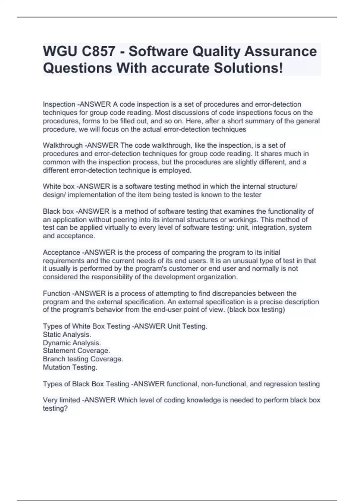 WGU C857 - Software Quality Assurance Questions With accurate Solutions! Inspection -ANSWER A code inspection is a set of procedures and error-detection techniques for group code reading. Most discussions of code inspections focus on the procedures, forms to be filled out, and so on. Here, after a short summary of the general procedure, we will focus on the actual error-detection techniques Walkthrough -ANSWER The code walkthrough, like the inspection, is a set of procedures and error-detection techniques for group code reading. It shares much in common with the inspection process, but the procedures are slightly different, and a different error-detection technique is employed. White box -ANSWER is a software testing method in which the internal structure/ design/ implementation of the item being tested is known to the tester Black box -ANSWER is a method of software testing that examines the functionality of an application without peering into its internal structures or workings. This method of test can be applied virtually to every level of software testing: unit, integration, system and acceptance. Acceptance -ANSWER is the process of comparing the program to its initial requirements and the current needs of its end users. It is an unusual type of test in that it usually is performed by the program's customer or end user and normally is not considered the responsibility of the development organization. Function -ANSWER is a process of attempting to find discrepancies between the program and the external specification. An external specification is a precise description of the program's behavior from the end-user point of view. (black box testing) Types of White Box Testing -ANSWER Unit Testing. Static Analysis. Dynamic Analysis. Statement Coverage. Branch testing Coverage. Mutation Testing. Types of Black Box Testing -ANSWER functional, non-functional, and regression testing Very limited -ANSWER Which level of coding knowledge is needed to perform black box testing? Sy
