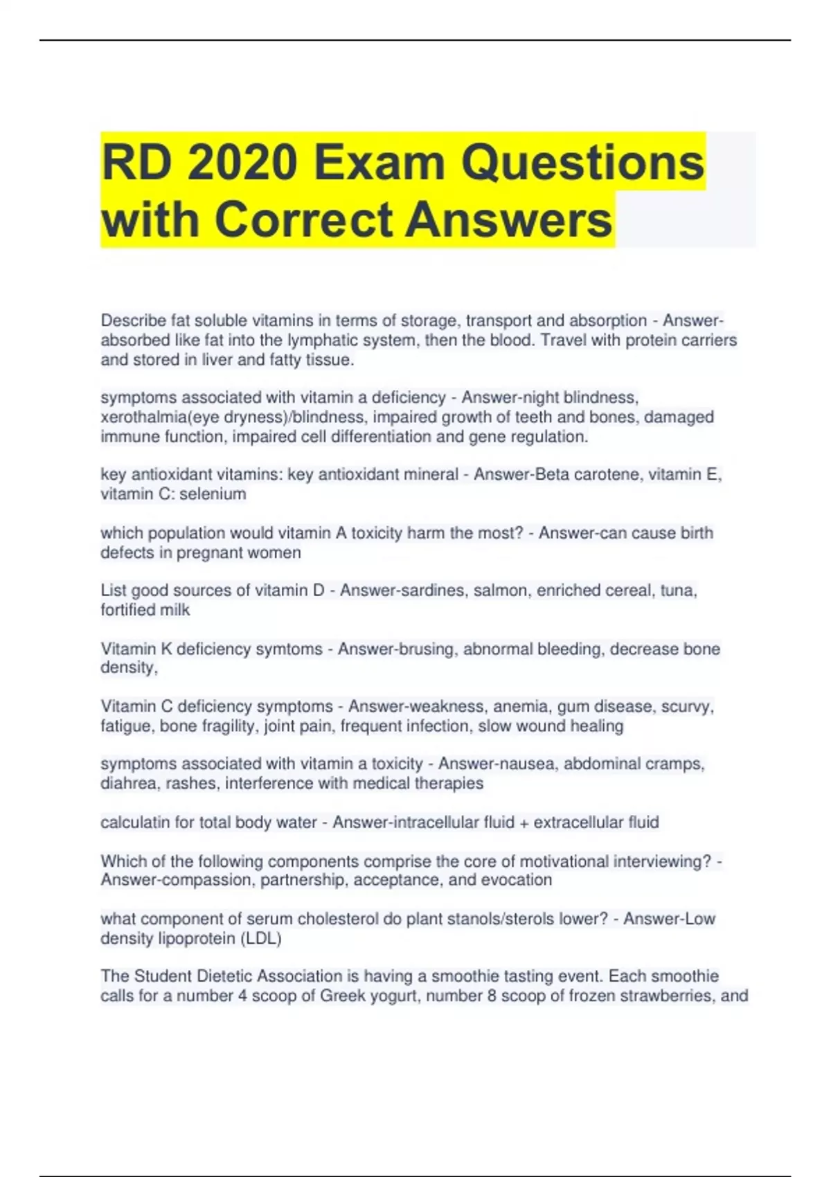 RD 2020 Exam Questions with Correct Answers Describe fat soluble vitamins in terms of storage, transport and absorption - Answerabsorbed like fat into the lymphatic system, then the blood. Travel with protein carriers and stored in liver and fatty tissue. symptoms associated with vitamin a deficiency - Answer-night blindness, xerothalmia(eye dryness)/blindness, impaired growth of teeth and bones, damaged immune function, impaired cell differentiation and gene regulation. key antioxidant vitamins: key antioxidant mineral - Answer-Beta carotene, vitamin E, vitamin C: selenium which population would vitamin A toxicity harm the most? - Answer-can cause birth defects in pregnant women List good sources of vitamin D - Answer-sardines, salmon, enriched cereal, tuna, fortified milk Vitamin K deficiency symtoms - Answer-brusing, abnormal bleeding, decrease bone density, Vitamin C deficiency symptoms - Answer-weakness, anemia, gum disease, scurvy, fatigue, bone fragility, joint pain, frequent infection, slow wound healing symptoms associated with vitamin a toxicity - Answer-nausea, abdominal cramps, diahrea, rashes, interference with medical therapies calculatin for total body water - Answer-intracellular fluid + extracellular fluid Which of the following components comprise the core of motivational interviewing? - Answer-compassion, partnership, acceptance, and evocation what component of serum cholesterol do plant stanols/sterols lower? - Answer-Low density lipoprotein (LDL) The Student Dietetic Association is having a smoothie tasting event. Each smoothie calls for a number 4 scoop of Greek yogurt, number 8 scoop of frozen strawberries, and a number 8 scoop of fresh blueberries. You anticipate 450 attendees at the event. How many gallons of Greek yogurt will you need? - Answer-Scoop sizes are based on the number of scoops it takes to fill a 32 fl oz container. A number 4 scoop holds 1 cup. For 450 attendees, 450 cups of Greek yogurt are needed. Since there are 16 cups in a gallon, divide 450 by 16 to get 28.12 gallons. To feed everyone, 29 gallons are needed. Which of the following viruses is the most common cause of sporadic cases and outbreaks of foodborne illness? - Answer-norovirus Which ratio is designed to examine how effectively an organization is utilizing its assets? - Answer-Inventory turnover assets-to-liabilities ratio - Answer-calculates the percentage of assets provided by debt. The debt-to-equity ratio - Answer-tells what percentage of the company's assets are funded by shareholders' equity and debt. Which statement best describes the "A" component of the FADE performance improvement model? - Answer-includes collection of data that are analyzed in order to establish baseline understanding of current processes. The process that will be improved is selected during the focus stage, action plans are developed during the development stage, and the plan is implemented during the execution stage. Using food-based menu planning, the required portion size for meat/meat alternate served in a reimbursable lunch to students in grades 9 through 12 must be - Answer-2 oz Which additive is in baking powder and reacts with the sodium bicarbonate to produce carbon dioxide gas? - Answer-Sodium aluminum sulfate Which additive would add sweetness, act as a stabilizer and thickener, and retain moistness in a muffin? - Answer-Sorbitol; Sorbitol is used as a humectant in many types of products for protection against loss of moisture content. The moisture-stabilizing and textural properties of sorbitol are used in the production of confectionery, baked goods, and chocolate, as these products tend to become dry or harden. Since July 2012, children in grades K through 5 must be served a minimum of ______ cup vegetables with each National School Lunch Program reimbursable lunch. - Answer-3/4 The third step in developing one's professional portfolio to maintain status as an RDN or NDTR include - Answer-developing a learning plan that shows how the professional will meet established goals. The minimum amount of fiber recommended for a 10-year-old child is - AnswerBeginning at age 2, it is recommended that fiber intake be equal to or greater than a child's age plus 5 grams. So a 10-year-old would be encouraged to have 15 grams of fiber per day. In the ETHNIC model of culturally competent care, the "E" stands for - Answer-In the ETHNIC model, explanation about the culture by the client is the first step. Which program was designed by CDC to determine the burden of foodborne disease in the United States, monitor trends of specific foodborne illnesses over time, attribute the burden of foodborne illness to specific foods and settings, and develop and assess interventions to reduce the burden of foodborne illness? - Answer-FoodNet The FDA, Food Safety and Inspection Service, and CDC jointly publish this reference document for regulatory agencies responsible for overseeing food safety in retail outlets: - Answer-food code