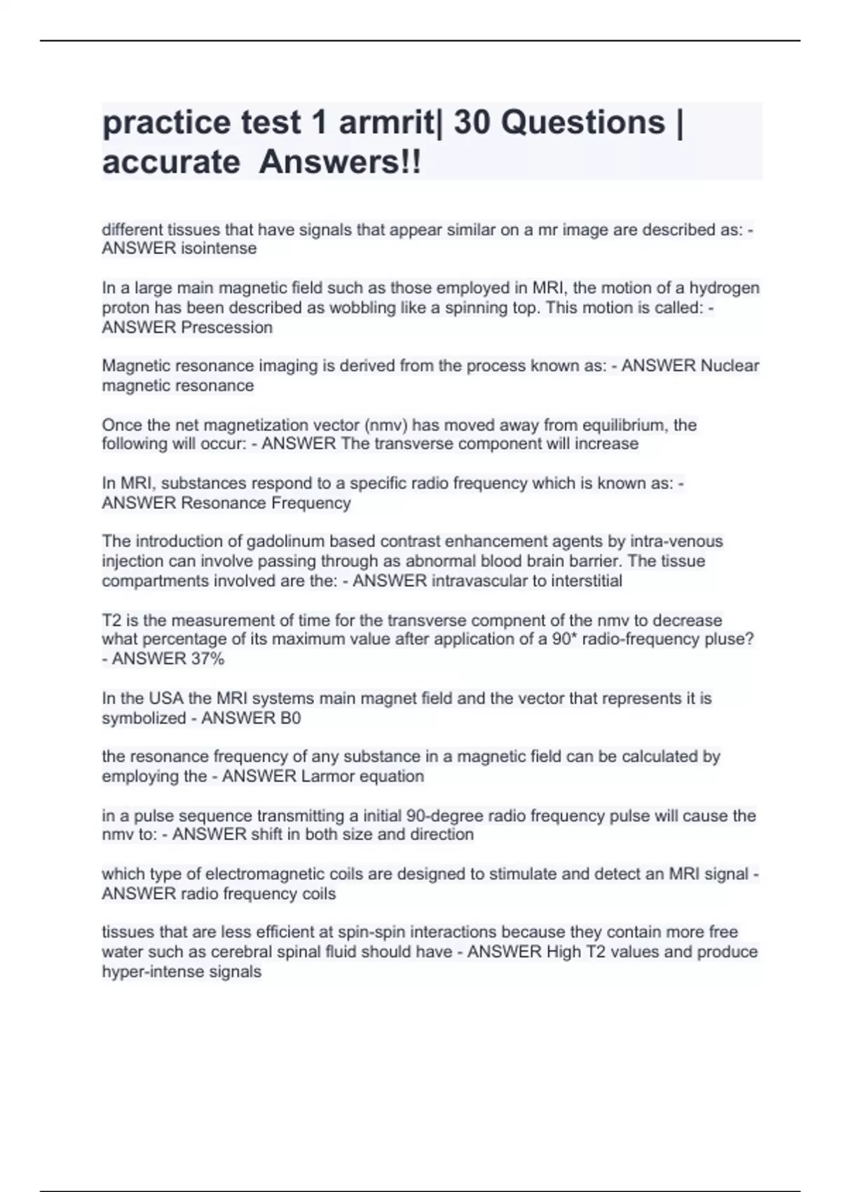 practice test 1 armrit| 30 Questiondifferent tissues that have signals that appear similar on a mr image are described as: - ANSWER isointense In a large main magnetic field such as those employed in MRI, the motion of a hydrogen proton has been described as wobbling like a spinning top. This motion is called: - ANSWER Prescession Magnetic resonance imaging is derived from the process known as: - ANSWER Nuclear magnetic resonance Once the net magnetization vector (nmv) has moved away from equilibrium, the following will occur: - ANSWER The transverse component will increase In MRI, substances respond to a specific radio frequency which is known as: - ANSWER Resonance Frequency The introduction of gadolinum based contrast enhancement agents by intra-venous injection can involve passing through as abnormal blood brain barrier. The tissue compartments involved are the: - ANSWER intravascular to interstitial T2 is the measurement of time for the transverse compnent of the nmv to decrease what percentage of its maximum value after application of a 90* radio-frequency pluse? - ANSWER 37% In the USA the MRI systems main magnet field and the vector that represents it is symbolized - ANSWER B0 the resonance frequency of any substance in a magnetic field can be calculated by employing s | accurate Answers!!