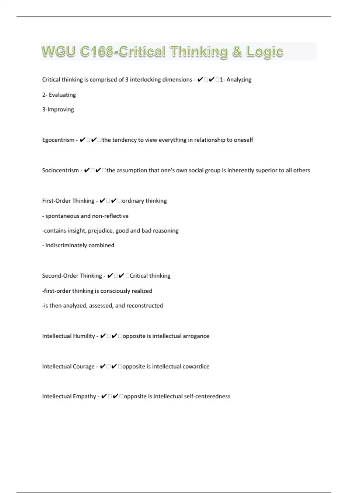 Critical thinking is comprised of 3 interlocking dimensions - ️️1- Analyzing 2- Evaluating 3-Improving Egocentrism - ️️the tendency to view everything in relationship to oneself Sociocentrism - ️️the assumption that one's own social group is inherently superior to all others First-Order Thinking - ️️ordinary thinking - spontaneous and non-reflective -contains insight, prejudice, good and bad reasoning - indiscriminately combined Second-Order Thinking - ️️Critical thinking -first-order thinking is consciously realized -is then analyzed, assessed, and reconstructed Intellectual Humility - ️️opposite is intellectual arrogance Intellectual Courage - ️️opposite is intellectual cowardice Intellectual Empathy - ️️opposite is intellectual self-centeredness