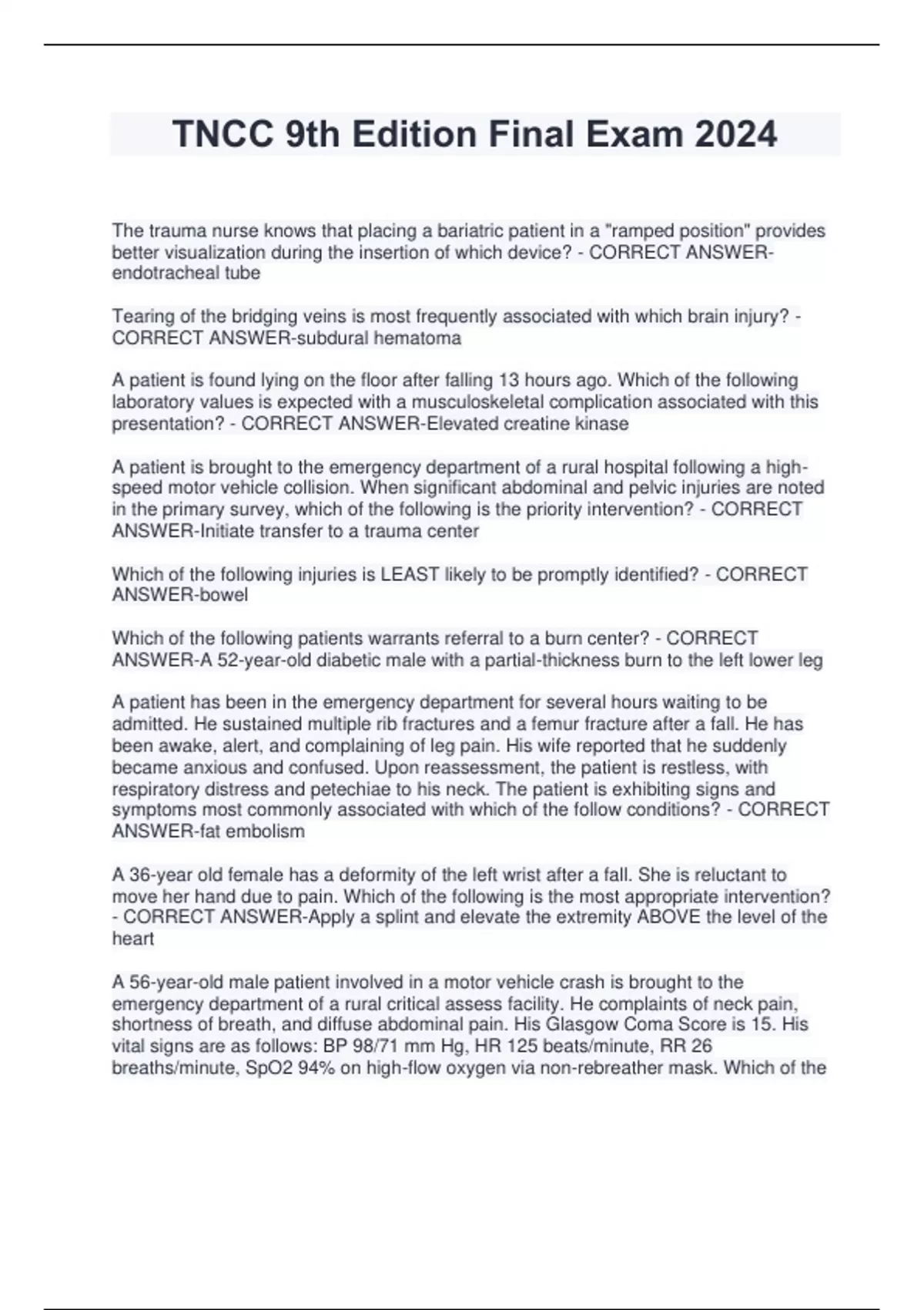 TNCC 9th Edition Final Exam 2024 The trauma nurse knows that placing a bariatric patient in a "ramped position" provides better visualization during the insertion of which device? - CORRECT ANSWERendotracheal tube Tearing of the bridging veins is most frequently associated with which brain injury? - CORRECT ANSWER-subdural hematoma A patient is found lying on the floor after falling 13 hours ago. Which of the following laboratory values is expected with a musculoskeletal complication associated with this presentation? - CORRECT ANSWER-Elevated creatine kinase A patient is brought to the emergency department of a rural hospital following a highspeed motor vehicle collision. When significant abdominal and pelvic injuries are noted in the primary survey, which of the following is the priority intervention? - CORRECT ANSWER-Initiate transfer to a trauma center Which of the following injuries is LEAST likely to be promptly identified? - CORRECT ANSWER-bowel Which of the following patients warrants referral to a burn center? - CORRECT ANSWER-A 52-year-old diabetic male with a partial-thickness burn to the left lower leg A patient has been in the emergency department for several hours waiting to be admitted. He sustained multiple rib fractures and a femur fracture after a fall. He has been awake, alert, and complaining of leg pain. His wife reported that he suddenly became anxious and confused. Upon reassessment, the patient is restless, with respiratory distress and petechiae to his neck. The patient is exhibiting signs and symptoms most commonly associated with which of the follow conditions? - CORRECT ANSWER-fat embolism A 36-year old female has a deformity of the left wrist after a fall. She is reluctant to move her hand due to pain. Which of the following is the most appropriate intervention? - CORRECT ANSWER-Apply a splint and elevate the extremity ABOVE the level of the heart A 56-year-old male patient involved in a motor vehicle crash is brought to the emergency department of a rural critical assess facility. He complaints of neck pain, shortness of breath, and diffuse abdominal pain. His Glasgow Coma Score is 15. His vital signs are as follows: BP 98/71 mm Hg, HR 125 beats/minute, RR 26 breaths/minute, SpO2 94% on high-flow oxygen via non-rebreather mask. Which of the follow is the priority intervention for this patient? - CORRECT ANSWER-Expedite transfer to the closest trauma center Which of the following values indicates the need for alcohol withdrawal interventions? - CORRECT ANSWER-CIWA-Ar of 36 A trauma patient is en route to a rural emergency department. Radiology notifies the charge nurse that the computed tomography (CT) scanner will be out of service for several hours. The team gathers to plan accordingly. Which of the following terms best describes this trauma team's communication? - CORRECT ANSWER-huddle A patient with a complete spinal cord injury in neurogenic shock will demonstrate hypotension and which other clinical signs? - CORRECT ANSWER-Bradycardia and absent motor function below the level of injury Which of the following is true about the log-roll maneuver? - CORRECT ANSWER-It can worsen cord damage from a unstable spinal injury What factor contributes most to the kinetic energy of a body in motion? - CORRECT ANSWER-velocity A 5-year-old child presents to the ED with bruises to the upper arms and buttocks in various stages of healing and multiple small, clean, round burns to the back. There are no abnormalities found based on the pediatric assess