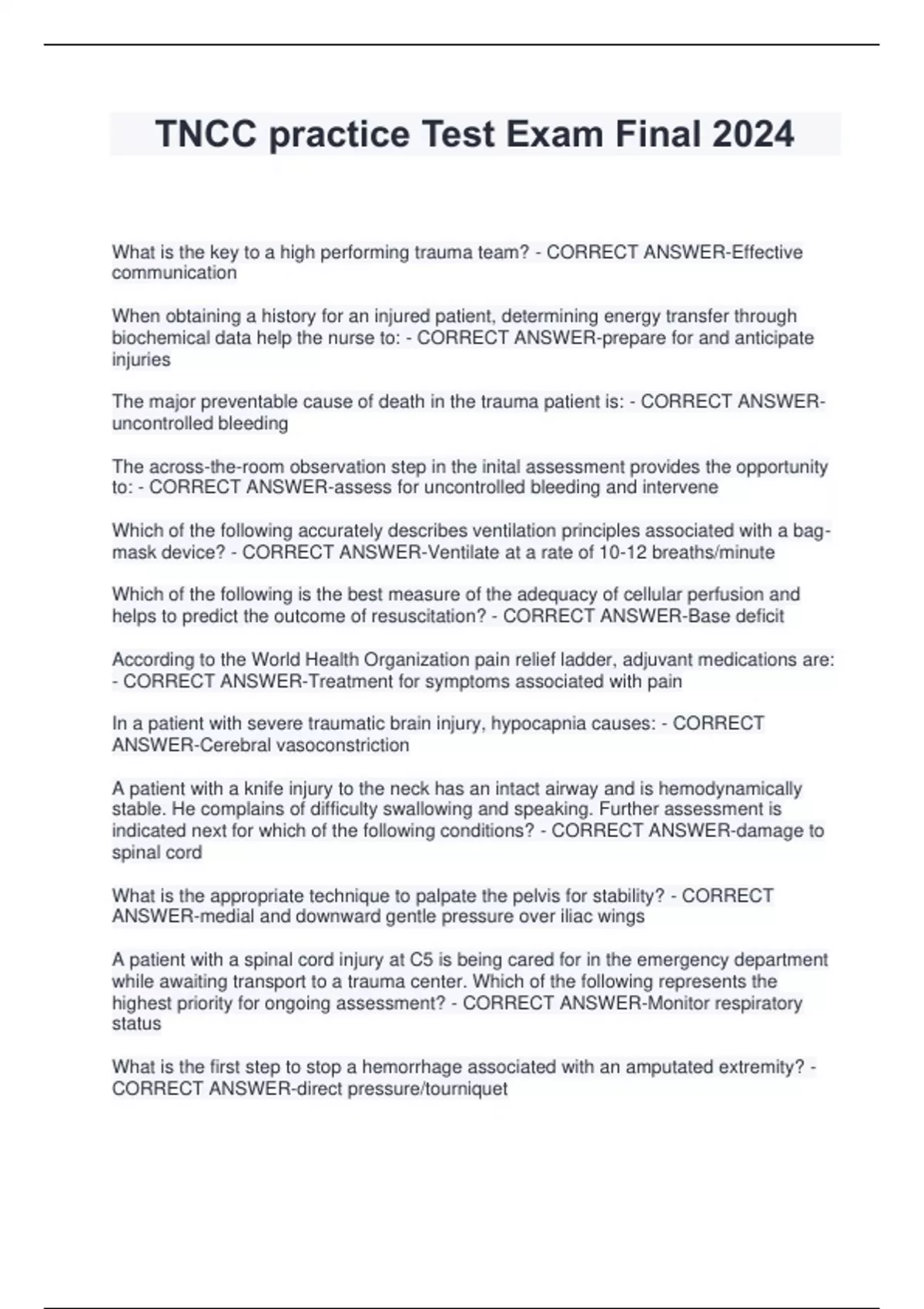 TNCC practice Test Exam Final 2024 What is the key to a high performing trauma team? - CORRECT ANSWER-Effective communication When obtaining a history for an injured patient, determining energy transfer through biochemical data help the nurse to: - CORRECT ANSWER-prepare for and anticipate injuries The major preventable cause of death in the trauma patient is: - CORRECT ANSWERuncontrolled bleeding The across-the-room observation step in the inital assessment provides the opportunity to: - CORRECT ANSWER-assess for uncontrolled bleeding and intervene Which of the following accurately describes ventilation principles associated with a bagmask device? - CORRECT ANSWER-Ventilate at a rate of 10-12 breaths/minute Which of the following is the best measure of the adequacy of cellular perfusion and helps to predict the outcome of resuscitation? - CORRECT ANSWER-Base deficit According to the World Health Organization pain relief ladder, adjuvant medications are: - CORRECT ANSWER-Treatment for symptoms associated with pain In a patient with severe traumatic brain injury, hypocapnia causes: - CORRECT ANSWER-Cerebral vasoconstriction A patient with a knife injury to the neck has an intact airway and is hemodynamically stable. He complains of difficulty swallowing and speaking. Further assessment is indicated next for which of the following conditions? - CORRECT ANSWER-damage to spinal cord What is the appropriate technique to palpate the pelvis for stability? - CORRECT ANSWER-medial and downward gentle pressure over iliac wings A patient with a spinal cord injury at C5 is being cared for in the emergency department while awaiting transport to a trauma center. Which of the following represents the highest priority for ongoing assessment? - CORRECT ANSWER-Monitor respiratory status What is the first step to stop a hemorrhage associated with an amputated extremity? - CORRECT ANSWER-direct pressure/tournique