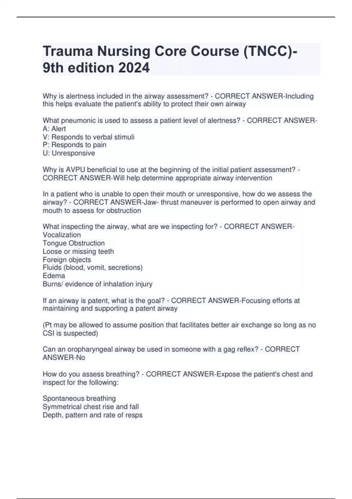 Trauma Nursing Core Course (TNCC)- 9th edition 2024 Why is alertness included in the airway assessment? - CORRECT ANSWER-Including this helps evaluate the patient's ability to protect their own airway What pneumonic is used to assess a patient level of alertness? - CORRECT ANSWERA: Alert V: Responds to verbal stimuli P: Responds to pain U: Unresponsive Why is AVPU beneficial to use at the beginning of the initial patient assessment? - CORRECT ANSWER-Will help determine appropriate airway intervention In a patient who is unable to open their mouth or unresponsive, how do we assess the airway? - CORRECT ANSWER-Jaw- thrust maneuver is performed to open airway and mouth to assess for obstruction What inspecting the airway, what are we inspecting for? - CORRECT ANSWERVocalization Tongue Obstruction Loose or missing teeth Foreign objects Fluids (blood, vomit, secretions) Edema Burns/ evidence of inhalation injury If an airway is patent, what is the goal? - CORRECT ANSWER-Focusing efforts at maintaining and supporting a patent airway (Pt may be allowed to assume position that facilitates better air exchange so long as no CSI is suspected) Can an oropharyngeal airway be used in someone with a gag reflex? - CORRECT ANSWER-No How do you assess breathing? - CORRECT ANSWER-Expose the patient's chest and inspect for the following: Spontaneous breathing Symmetrical chest rise and fall Depth, pattern and rate of resp