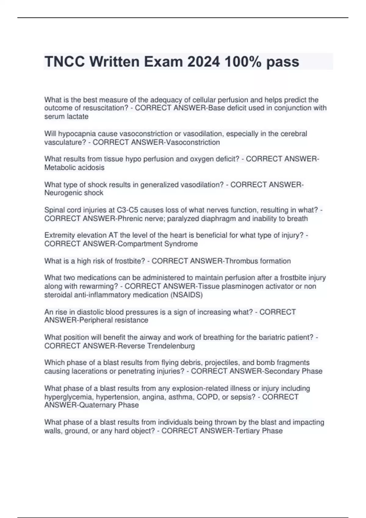 TNCC Written Exam 2024 100% pass What is the best measure of the adequacy of cellular perfusion and helps predict the outcome of resuscitation? - CORRECT ANSWER-Base deficit used in conjunction with serum lactate Will hypocapnia cause vasoconstriction or vasodilation, especially in the cerebral vasculature? - CORRECT ANSWER-Vasoconstriction What results from tissue hypo perfusion and oxygen deficit? - CORRECT ANSWERMetabolic acidosis What type of shock results in generalized vasodilation? - CORRECT ANSWERNeurogenic shock Spinal cord injuries at C3-C5 causes loss of what nerves function, resulting in what? - CORRECT ANSWER-Phrenic nerve; paralyzed diaphragm and inability to breath Extremity elevation AT the level of the heart is beneficial for what type of injury? - CORRECT ANSWER-Compartment Syndrome What is a high risk of frostbite? - CORRECT ANSWER-Thrombus formation What two medications can be administered to maintain perfusion after a frostbite injury along with rewarming? - CORRECT ANSWER-Tissue plasminogen activator or non steroidal anti-inflammatory medication (NSAIDS) An rise in diastolic blood pressures is a sign of increasing what? - CORRECT ANSWER-Peripheral resistance What position will benefit the airway and work of breathing for the bariatric patient? - CORRECT ANSWER-Reverse Trendelenburg Which phase of a blast results from flying debris, projectiles, and bomb fragments causing lacerations or penetrating injuries? - CORRECT ANSWER-Secondary Phase What phase of a blast results from any explosion-related illness or injury including hyperglycemia, hypertension, angina, asthma, COPD, or sepsis? - CORRECT ANSWER-Quaternary Phase What phase of a blast results from individuals being thrown by the blast and impacting walls, ground, or any hard object? - CORRECT ANSWER-Tertiary Phase What phase of a blast results from impact of the over and under pressurization wave with body surfaces. Injuries include blast lung, tympanic membrane rupture, abdominal hemorrhage, globe rupture, and mild traumatic brain injury? - CORRECT ANSWERPrimary Phase Signs of what include muscle pain or weakness, dark red or brown urine, general weakness or malaise, and elevated creatinine kinase levels? - CORRECT ANSWERRhabdomyolosis Signs of what include anxiety, pleuritic chest pain, dyspnea, hypoxemia, hemoptysis, cough, orthopnea, adventitious lung sounds, decreased lung sounds, jugular vein distention, or hypotension? - CORRECT ANSWER-Pulmonary Embolus Signs of what include headache, nausea and vomiting, amnesia, behavioral changes, altered level of consciousness? - CORRECT ANSWER-Increased intracranial pressure Signs of what include asymmetric pupillary reactivity, unilateral dilation, widening pulse pressure, abnormal motor posturing, bradycardia, and decreased respiratory effort? - CORRECT ANSWER-Late signs of increased ICP with Herniation Syndrome What is caused by the tear of the bridging veins or middle meningeal artery? - CORRECT ANSWER-Subdural and Epidural Hematoma Affect concentration, memory, sleep, mode, and libido. Causes headaches, dizziness and nausea. - CORRECT ANSWER-Postconcussive Syndrome/ Mild Traumatic Brain Injury Signs and symptoms similar to early signs of increased ICP but do not worsen. - CORRECT ANSWER-Postconcussive Syndrome/ Mild Traumatic Brain Injury Cerebral Perfusion Pressure = ______-______ - CORRECT ANSWER-MAP - ICP What is the range for CO2 to maximize perfusion? - CORRECT ANSWER-35-45 Does hypoventilation cause dilation or constriction? Increase or decrease ICP? - CORRECT ANSWER-Dilation and increase in ICP due to high CO2 Hyperventilation cause dilation or constriction? - CORRECT ANSWER-Constriction d/t low CO2 Pupils with pressure on cranial nerve - CORRECT ANSWER-Fixed and dilated Pupils with opiates vs stimulants - CORRECT ANSWER-small; large Pupils with anticholinergics such as atropine, ipratropium, an
