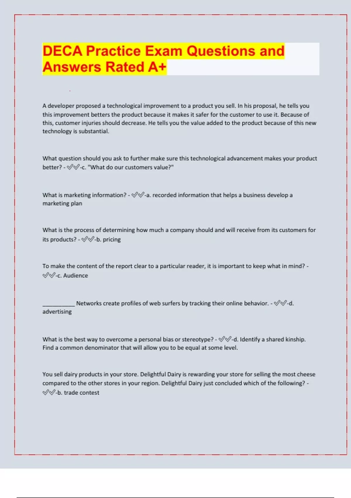 DECA Practice Exam Questions and Answers Rated A+ A developer proposed a technological improvement to a product you sell. In his proposal, he tells you this improvement betters the product because it makes it safer for the customer to use it. Because of this, customer injuries should decrease. He tells you the value added to the product because of this new technology is substantial. What question should you ask to further make sure this technological advancement makes your product better? - -c. "What do our customers value?" What is marketing information? - -a. recorded information that helps a business develop a marketing plan What is the process of determining how much a company should and will receive from its customers for its products? - -b. pricing To make the content of the report clear to a particular reader, it is important to keep what in mind? - -c. Audience __________ Networks create profiles of web surfers by tracking their online behavior. - -d. advertising What is the best way to overcome a personal bias or stereotype? - -d. Identify a shared kinship. Find a common denominator that will allow you to be equal at some level. You sell dairy products in your store. Delightful Dairy is rewarding your store for selling the most cheese compared to the other stores in your region. Delightful Dairy just concluded which of the following? - -b. trade contest What is the difference between a Defined Benefit and a Defined Contribution Pension Plan? - -d. Defined Benefit Plans have a set payment amount at retirement while a Defined Contribution Plans have a set amount of contributions thoughout the worklife of the employee. What is the overall best answer for the reason companies use business software? - -b. to record, organize, and report information and streamline processes What is the purpose of direct marketing? - -b