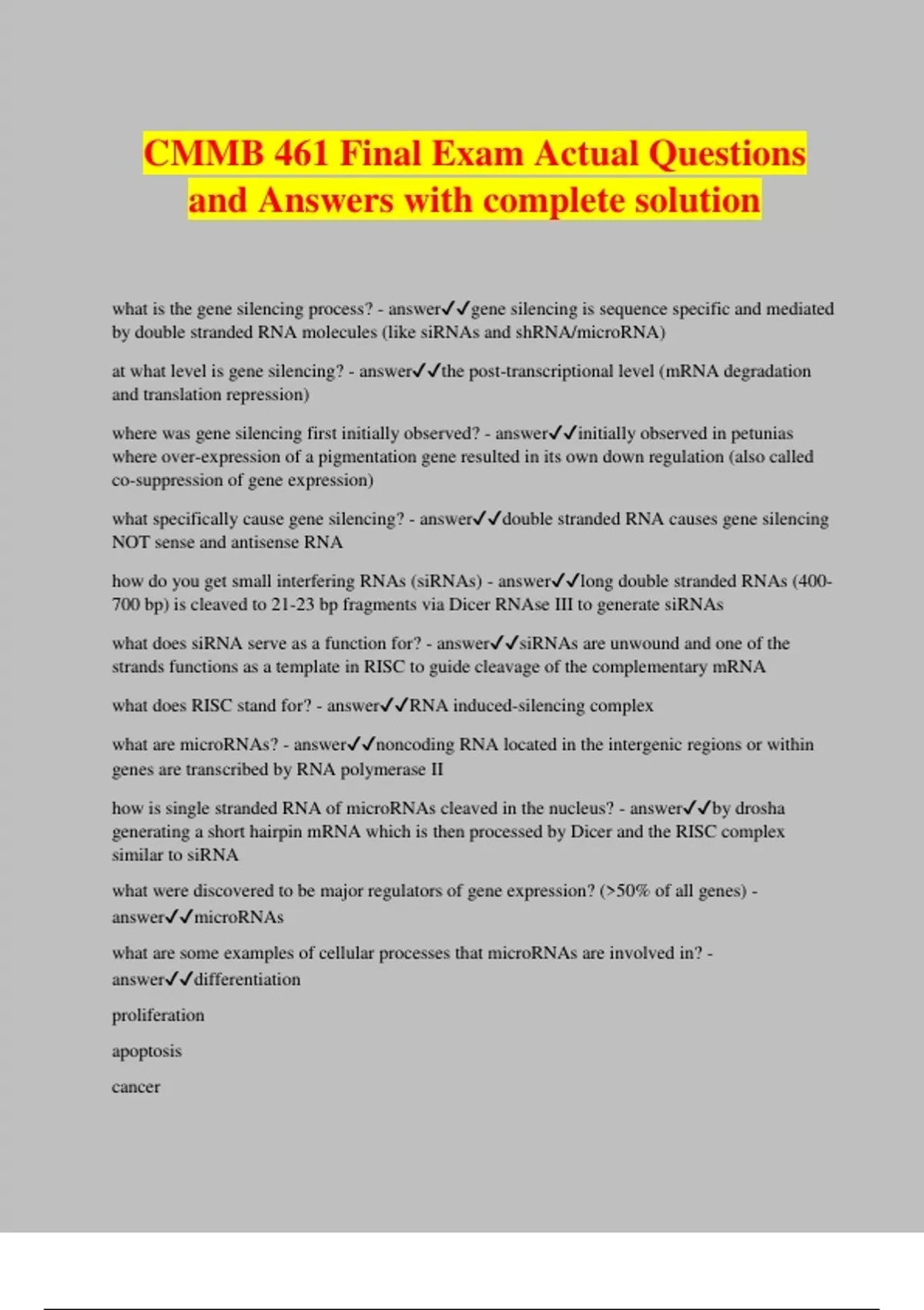 CMMB 461 Final Exam Actual Questions and Answers with complete solution what is the gene silencing process? - answergene silencing is sequence specific and mediated by double stranded RNA molecules (like siRNAs and shRNA/microRNA) at what level is gene silencing? - answerthe post-transcriptional level (mRNA degradation and translation repression) where was gene silencing first initially observed? - answerinitially observed in petunias where over-expression of a pigmentation gene resulted in its own down regulation (also called co-suppression of gene expression) what specifically cause gene silencing? - answerdouble stranded RNA causes gene silencing NOT sense and antisense RNA how do you get small interfering RNAs (siRNAs) - answerlong double stranded RNAs (400- 700 bp) is cleaved to 21-23 bp fragments via Dicer RNAse III to generate siRNAs what does siRNA serve as a function for? - answersiRNAs are unwound and one of the strands functions as a template in RISC to guide cleavage of the complementary mRNA what does RISC stand for? - answerRNA induced-silencing complex