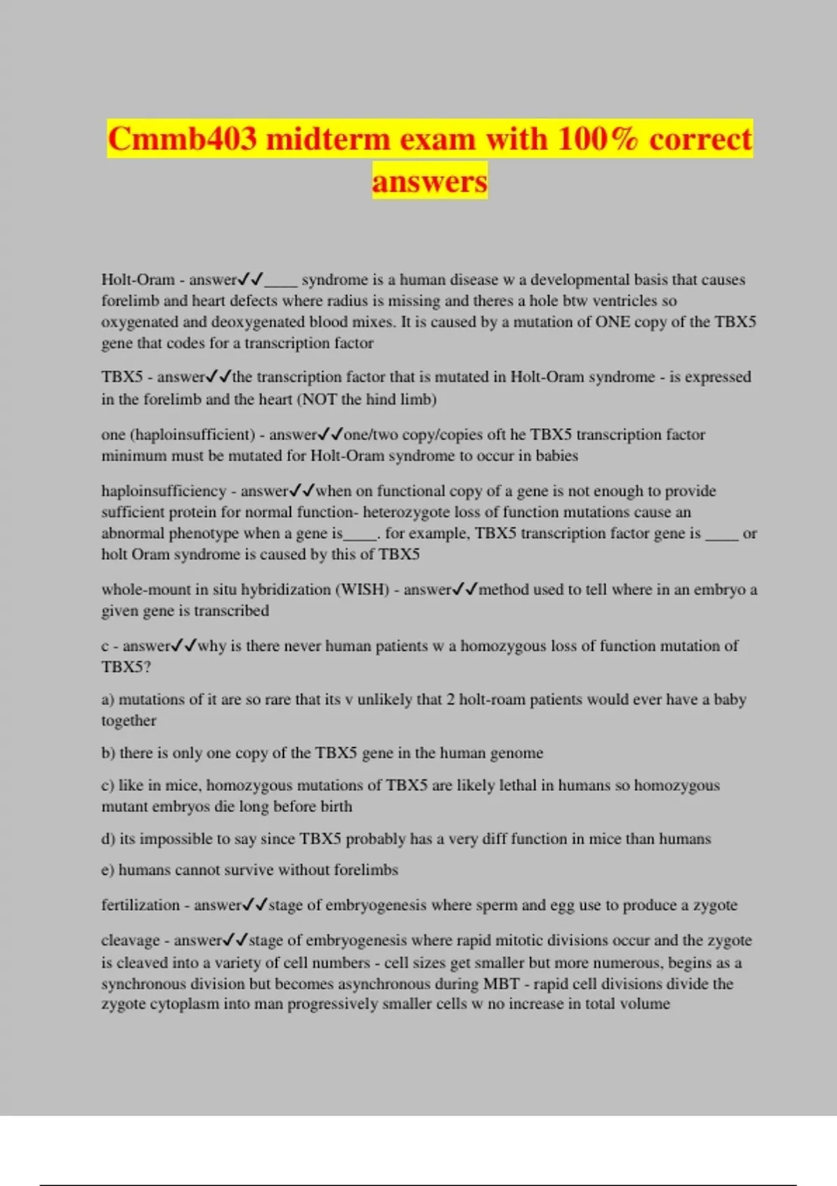 Cmmb403 midterm exam with 100% correct answers Holt-Oram - answer____ syndrome is a human disease w a developmental basis that causes forelimb and heart defects where radius is missing and theres a hole btw ventricles so oxygenated and deoxygenated blood mixes. It is caused by a mutation of ONE copy of the TBX5 gene that codes for a transcription factor TBX5 - answerthe transcription factor that is mutated in Holt-Oram syndrome - is expressed in the forelimb and the heart (NOT the hind limb) one (haploinsufficient) - answerone/two copy/copies oft he TBX5 transcription factor minimum must be mutated for Holt-Oram syndrome to occur in babies haploinsufficiency - answerwhen on functional copy of a gene is not enough to provide sufficient protein for normal function- heterozygote loss of function mutations cause an abnormal phenotype when a gene is____. for example, TBX5 transcription factor gene is ____ or holt Oram syndrome is caused by this of TBX5 whole-mount in situ hybridization (WISH) - answermethod used to tell where in an embryo a given gene is transcribed c - answerwhy is there never human patients w a homozygous loss of function mutation of TBX5? a) mutations of it are so rare that its v unlikely that 2 holt-roam patients would ever have a baby together b) there is only one copy of the TBX5 gene in the human genome c) like in mice, homozygous mutations of TBX5 are likely lethal in humans so homozygous mutant embryos die long before birth d) its impossible to say since TBX5 probably has a very diff function in mice than humans e) humans cannot survive without forelimbs fertilization - answerstage of embryogenesis where sperm and egg use to produce a zygote cleavage - answerstage of embryogenesis where rapid mitotic divisions occur and the zygote is cleaved into a variety of cell numbers - cell sizes get smaller but more numerous, begins as a synchronous division but becomes asynchronous during MBT - rapid cell divisions divide the zygote cytoplasm into man progressively smaller cells w no increase in total volum