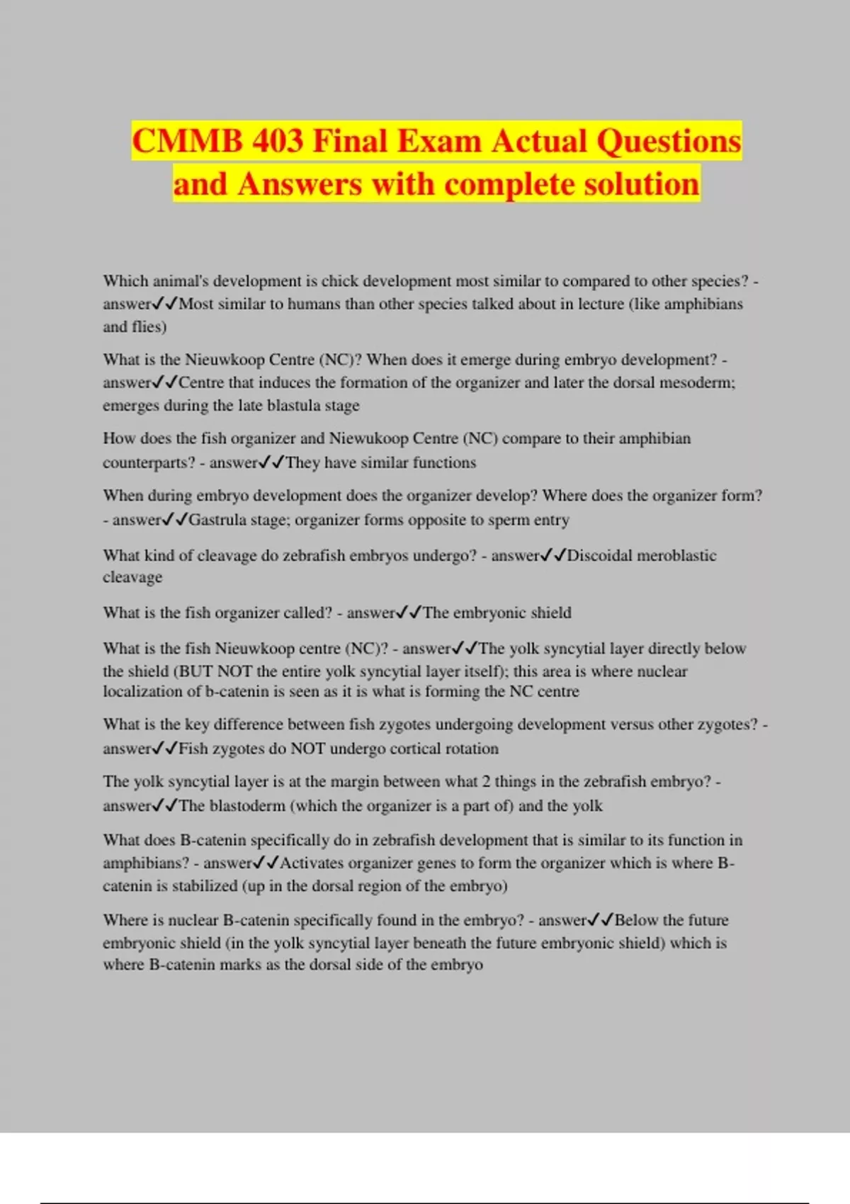 CMMB 403 Final Exam Actual Questions and Answers with complete solution Which animal's development is chick development most similar to compared to other species? - answerMost similar to humans than other species talked about in lecture (like amphibians and flies) What is the Nieuwkoop Centre (NC)? When does it emerge during embryo development? - answerCentre that induces the formation of the organizer and later the dorsal mesoderm; emerges during the late blastula stage How does the fish organizer and Niewukoop Centre (NC) compare to their amphibian counterparts? - answerThey have similar functions When during embryo development does the organizer develop? Where does the organizer form? - answerGastrula stage; organizer forms opposite to sperm entry What kind of cleavage do zebrafish embryos undergo? - answerDiscoidal meroblastic cleavage What is the fish organizer called? - answerThe embryonic shield What is the fish Nieuwkoop centre (NC)? - answerThe yolk syncytial layer directly below the shield (BUT NOT the entire yolk syncytial layer itself); this area is where nuclear localization of b-catenin is seen as it is what is forming the NC centre What is the key difference between fish zygotes undergoing development versus other zygotes? - answerFish zygotes do NOT undergo cortical rotation The yolk syncytial layer is at the margin between what 2 things in the zebrafish embryo? - answerThe blastoderm (which the organizer is a part of) and the yolk What does B-catenin specifically do in zebrafish development that is similar to its function in amphibians? - answerActivates organizer genes to form the organizer which is where B- catenin is stabilized (up in the dorsal region of the embryo) Where is nuclear B-catenin specifically found in the embryo? - answerBelow the future embryonic shield (in the yolk syncytial layer beneath the future embryonic shield) which is where B-catenin marks as the dorsal side of the embryo What does nuclear localization of B-catenin do and what does it help to form? - answerNuclear localization of b-catenin marks the dorsal side of the Xenopus blastula and helps form its Nieuwkoop center beneath the organizer What happens to the future embryonic shield after nuclear B-catenin is stabiliized below it? - answerFuture embryonic shield above the nuclear B-catenin cells thicken to become the organizer How do the molecules involved in zebrafish development (ie. organizer formation, etc) relate to the ones used in amphibians? - answerThey are homologous What 2 organizer genes does B-catenin activate expression of in zebrafish? What kind of proteins do each of these 2 genes express? Expression of these leads to expression of what molecules? - answerB-catenin activates expression of squint (which is nodal-like) and bozozok (which is a homeodomain that also happens to be siamois ortholog) Squint and bozozok both activate expression of chordino (a BMP inhibitor in zebrafish) as well as noggin, goosecoid, dickkopf (Wnt inhibitors) What is the mechanism of beta catenin accumulation in zebrafish? What movements were found to be not detected? - answerMechanism of beta-catenin accumulation in zebrafish is unknown - no cortical rotation or other morphogenetic movements have been detected Nuclear beta catenin has a direct effect on chordino expression (True/False) - answerFalse, beta catenin affects chordino expression indirectly through squint (nodal-like protein) and bozokok (homeoprotein) homologues What is squint a homologue of? What is bozokok a homologue of? - answerSquint is a homologue of Nodal (TGF beta paracrine factor) Bozokok is a homologue of siamois At the blastula stage, what is going on with the Nieuwkoop center? - answerThere is nuclear beta-catenin accumulation at the Nieuwkoop center Between zebrafish and Xenopus, which has a smaller embryo? - answerZebrafish embryo is smaller Gastrulation in aminiote embryos occurs through what structure? What does this structure contain? - answerA linear structure called the primitive streak (a characteristic feature of all amniote embryos) which contains a groove through which cells ingress to form the endoderm and mesoderm Cells (from the epiblast) that ingress through the primitive streak form what? Cell that don't ingress through the primitive streak form what? - answerCells that ingress through the primitive streak form the mesoderm and the endoderm while cells that DON'T ingress through the primitive streak form the ecto