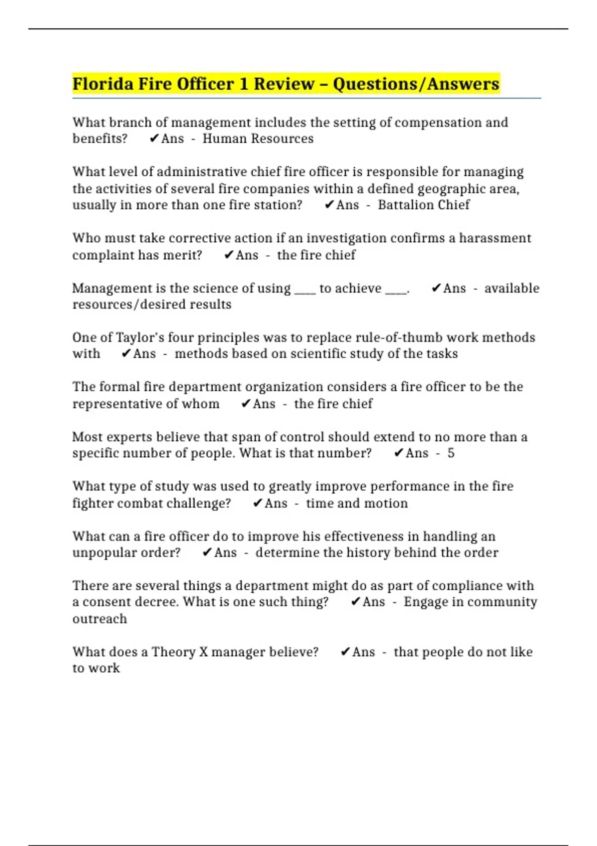 Florida Fire Officer 1 Review – Questions/Answers